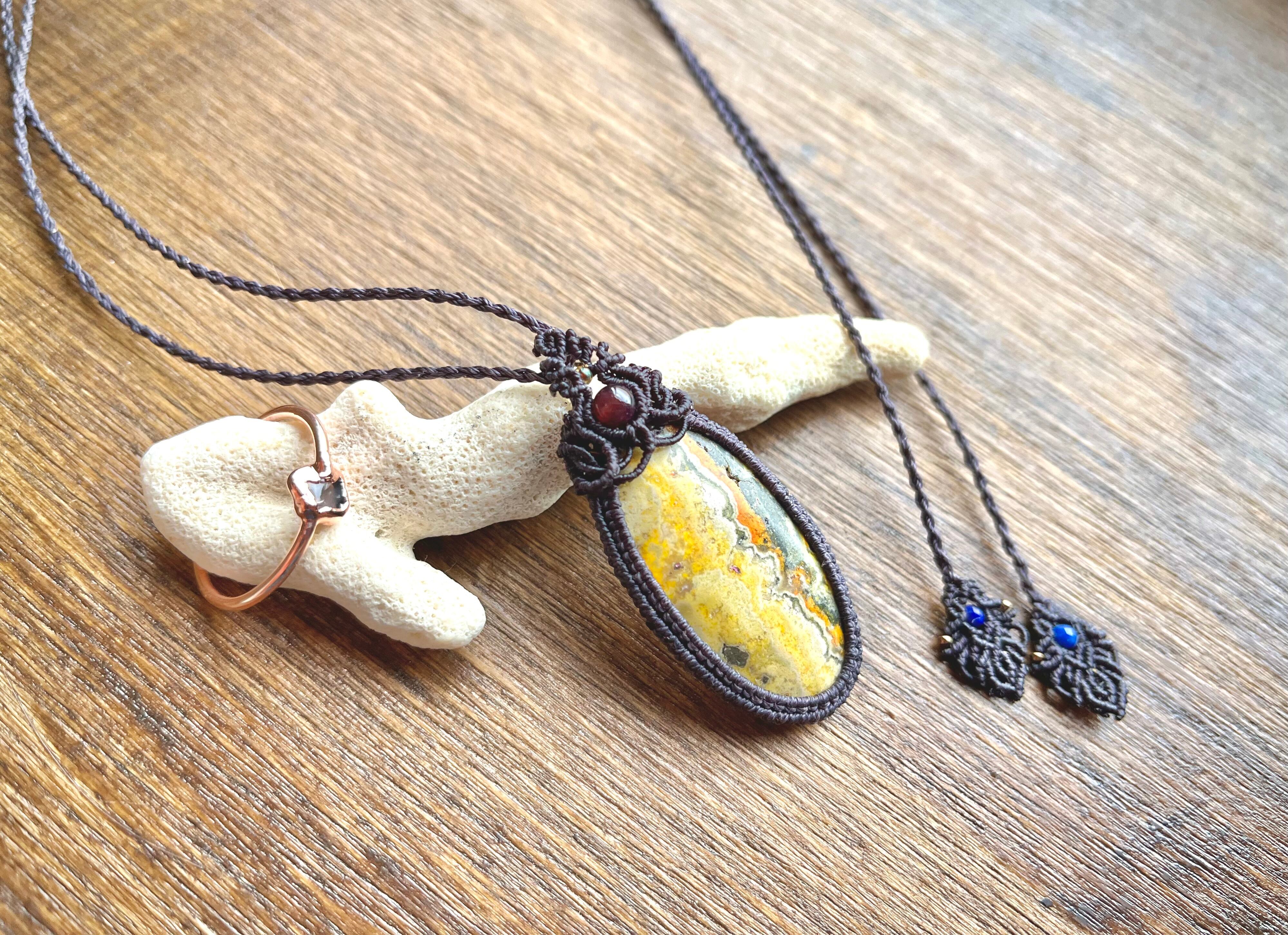 マクラメコードで編んだアジャスターで長さを調節出来るフリーサイズです。