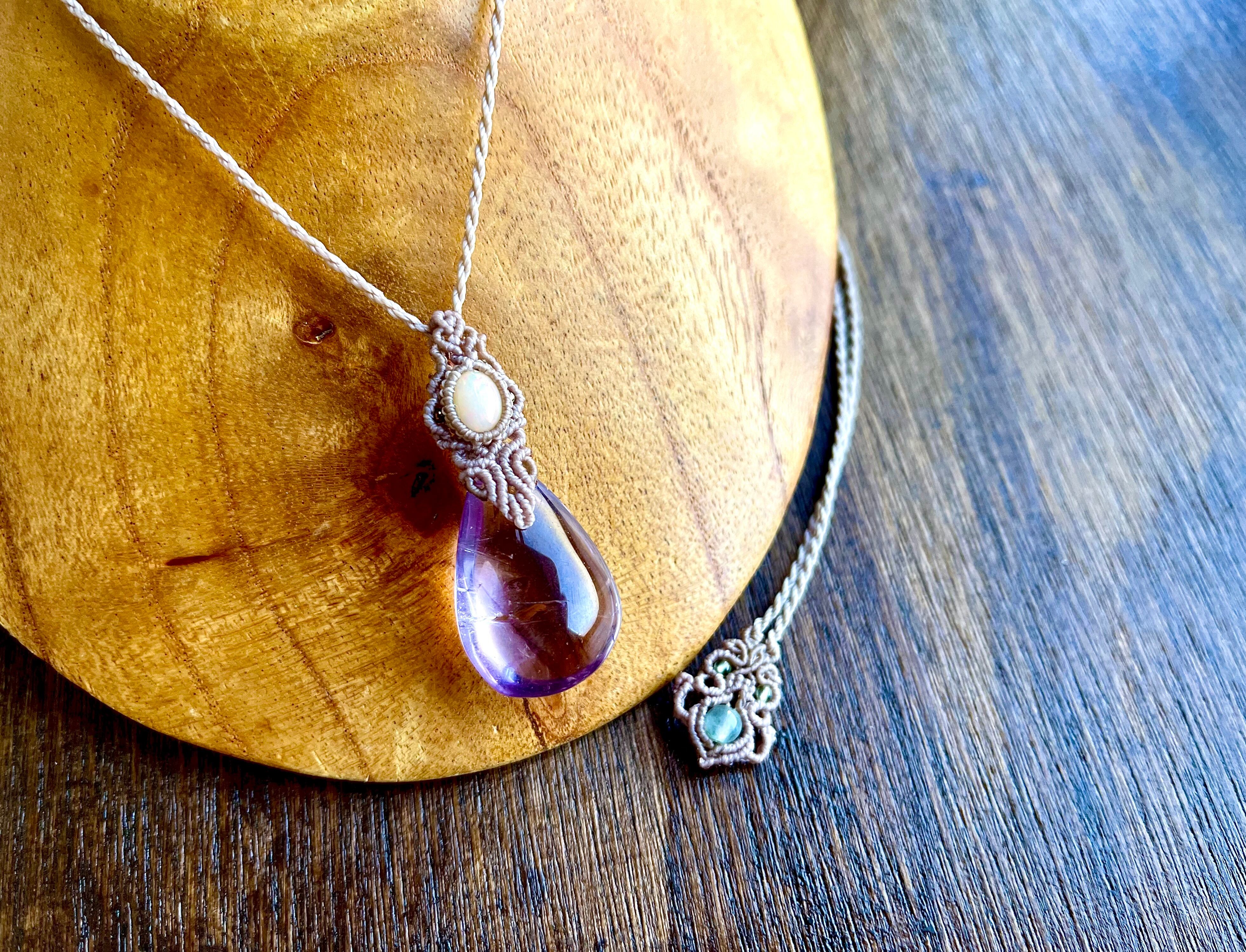 明るい紫色のアメジストと小粒ながら遊色の美しいオパールを合わせてペンダントにしました。