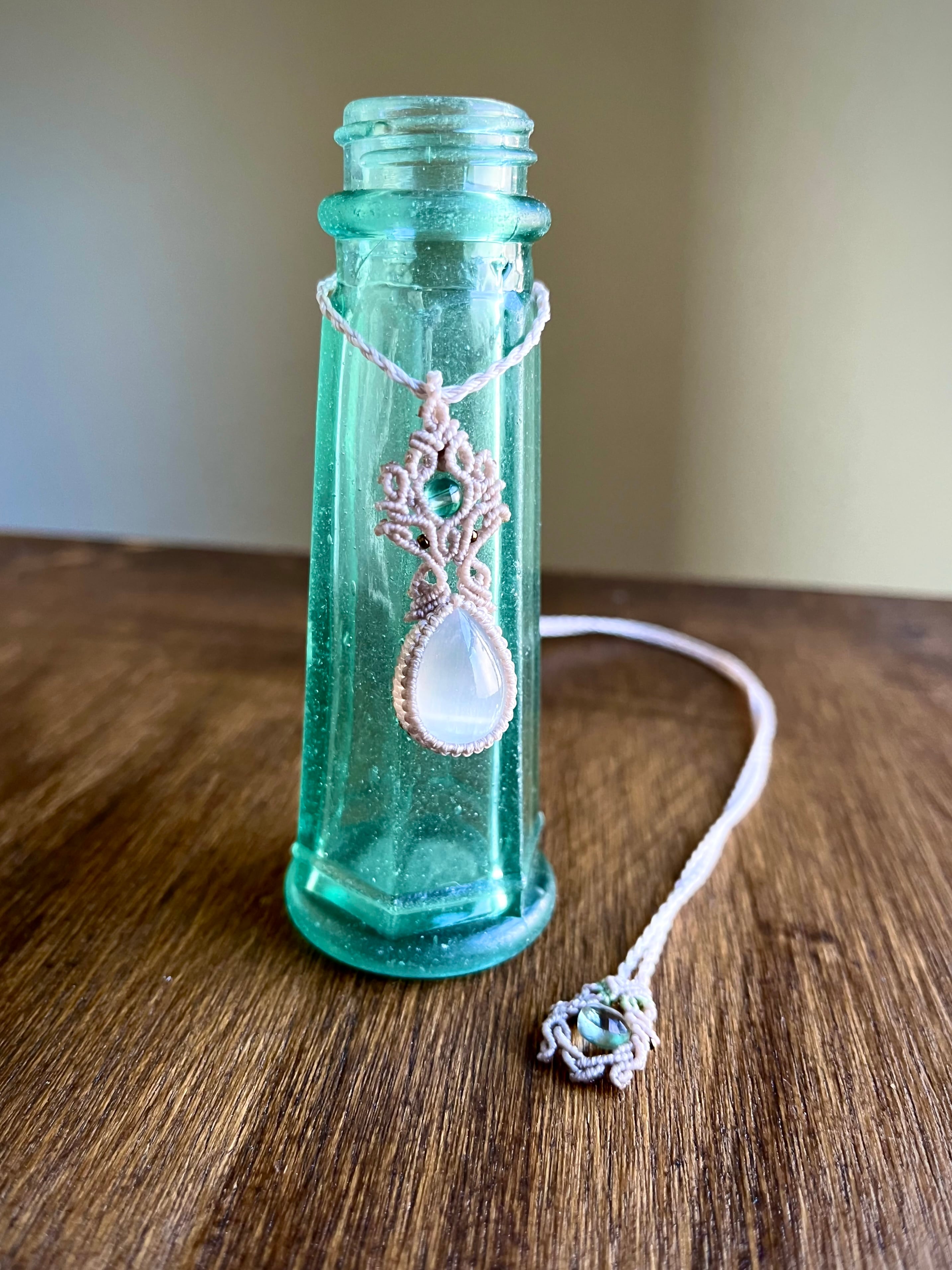 水晶ビーズ(染め)と合わせてペンダントに編みました。