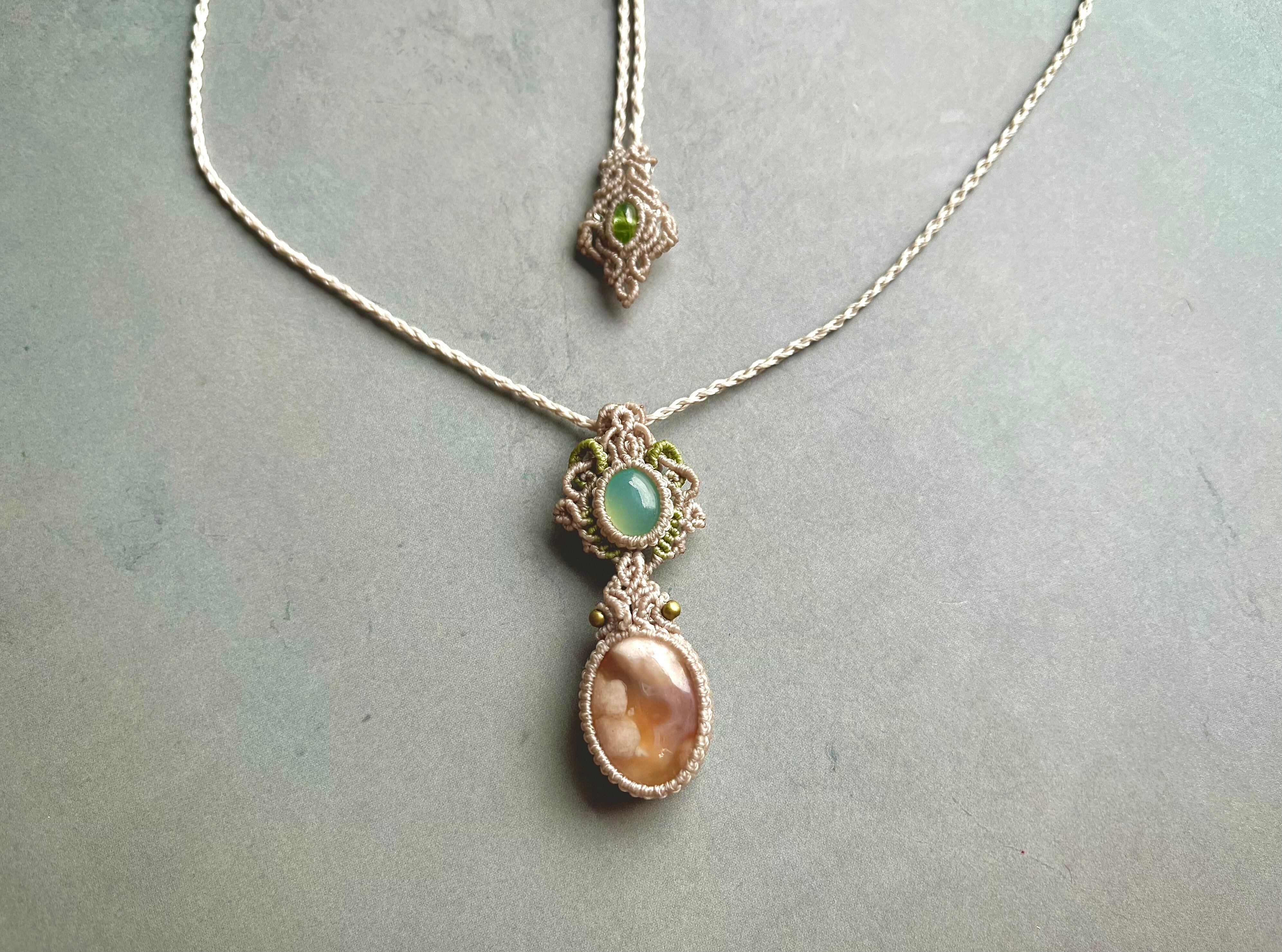 ピンクベージュの桜瑪瑙と淡いグリーンのライムグリーンカルセドニーを繋げて優しい雰囲気のペンダントに仕上げました。