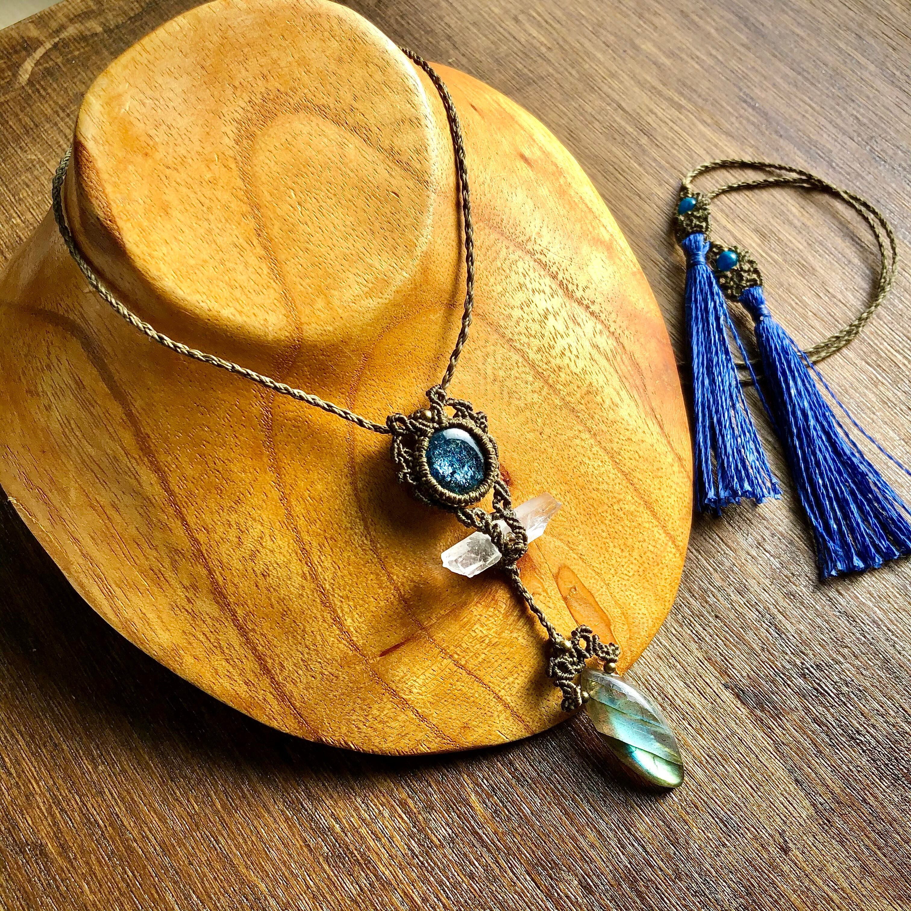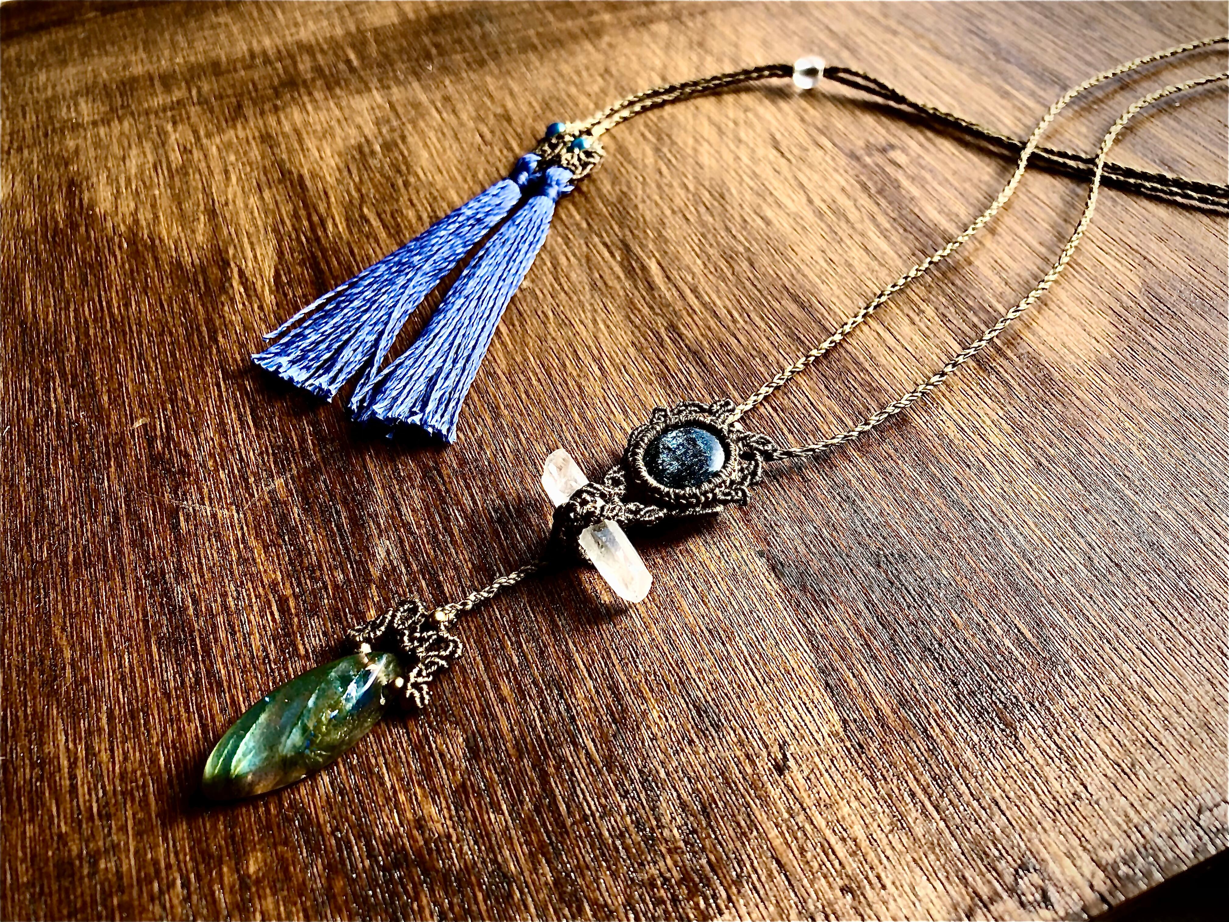 深い青のカイヤナイトとラブラドライトの真ん中に水晶ポイントをアクセントに差し込んだ連結ペンダントです。