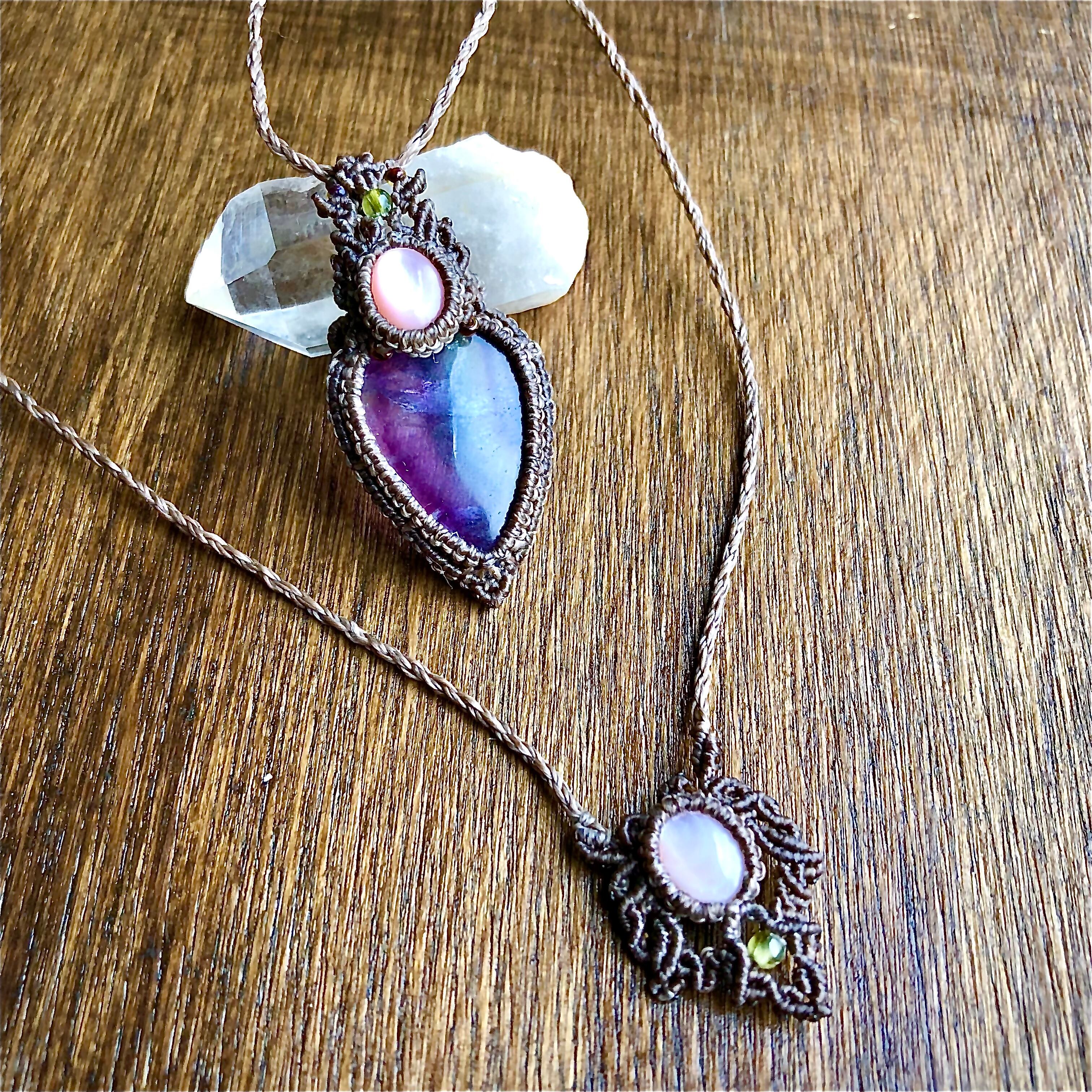 グラデーションの美しいフローライトにピンクのムーンストーンを乗せたマクラメペンダントです。