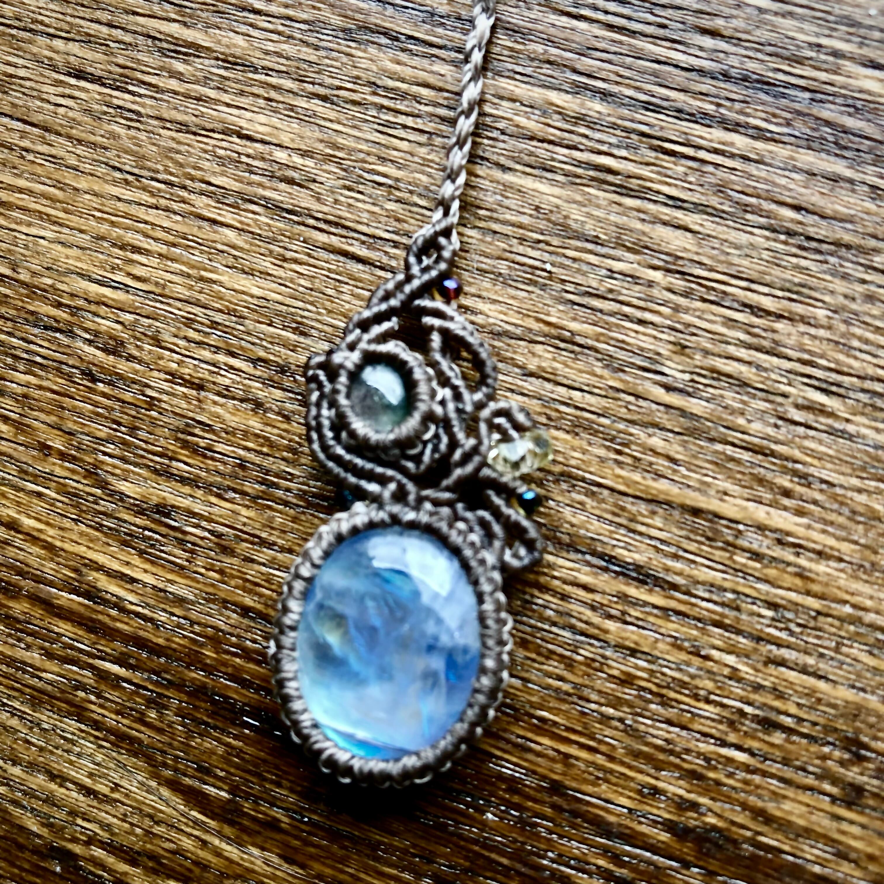青の発色の美しいラブラドライトとホワイトラブラドライトを繋げてペンダントに編みました。