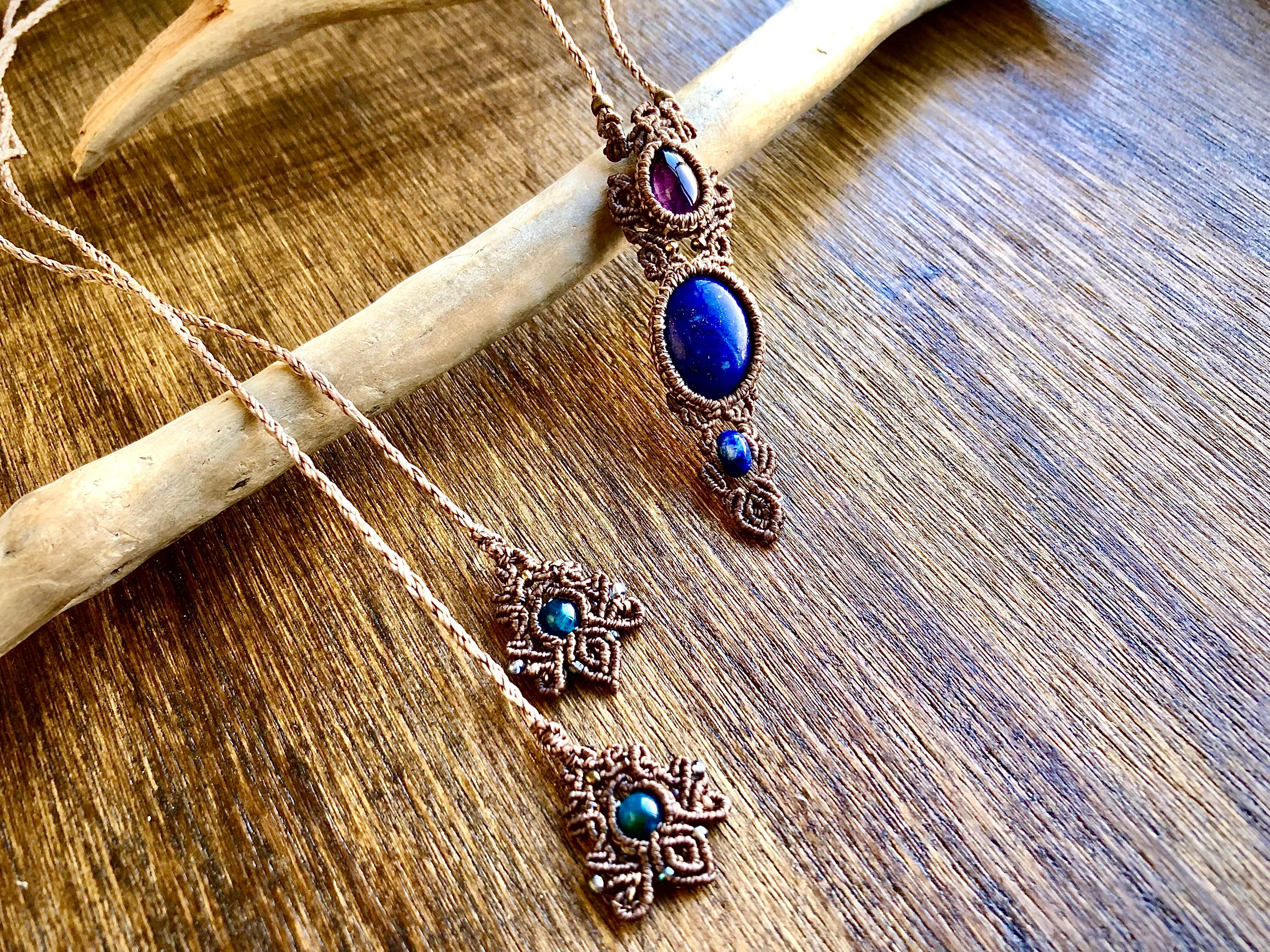 ラピスラズリを中心に、上に涙型のアメジスト、下にソーダライトのビーズを繋げてペンダントに編みました。