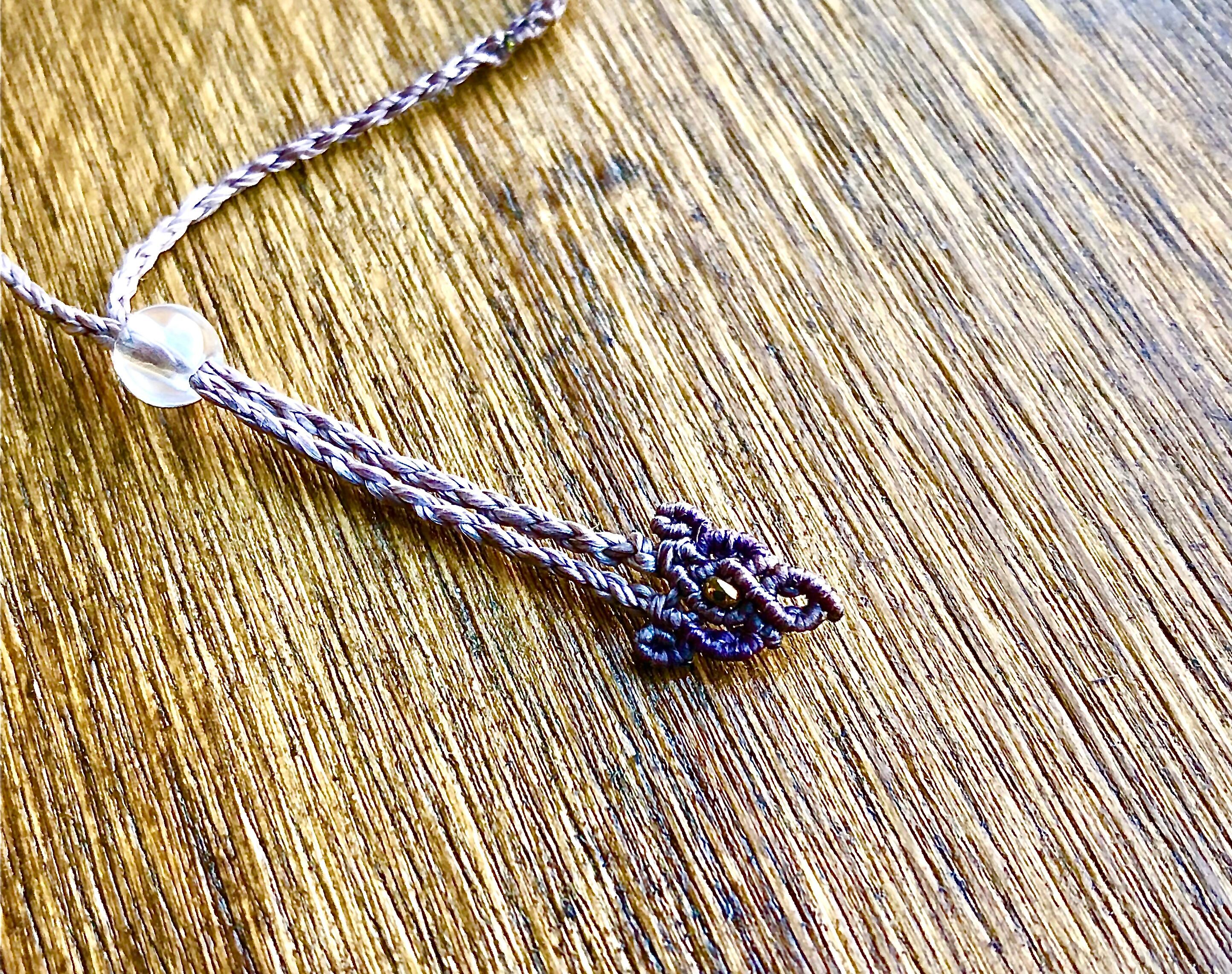 タンザナイトの周りは同色ながら少し紫の入った色味の糸を使用して遠目には少し浮き上がって見えるように囲んで編みました。