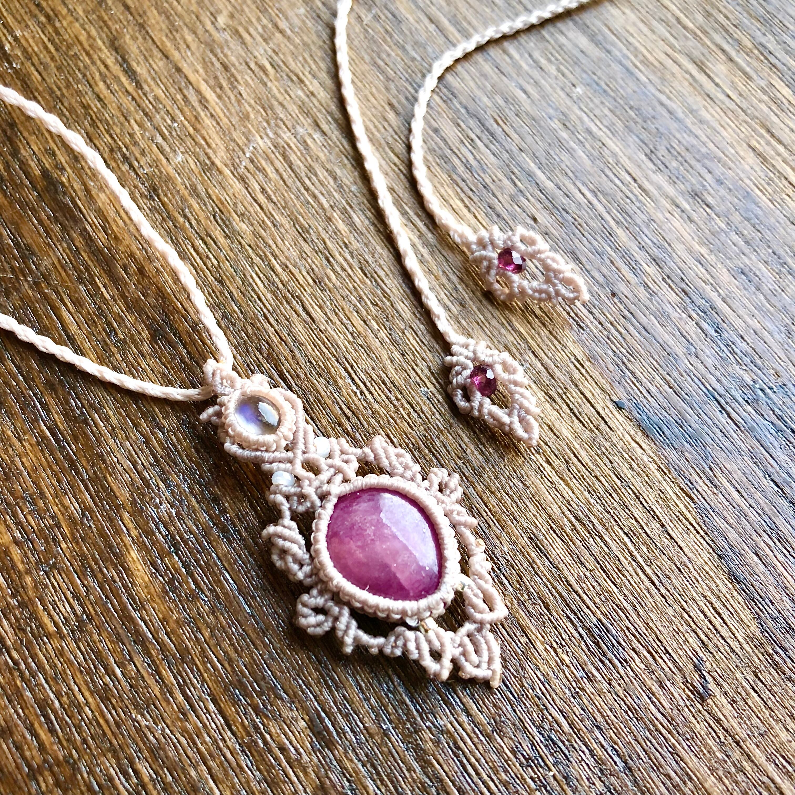モザンビーク産のパープルサファイアをほぼ透明のブルームーンストーンと繋げてマクラメペンダントにしました。