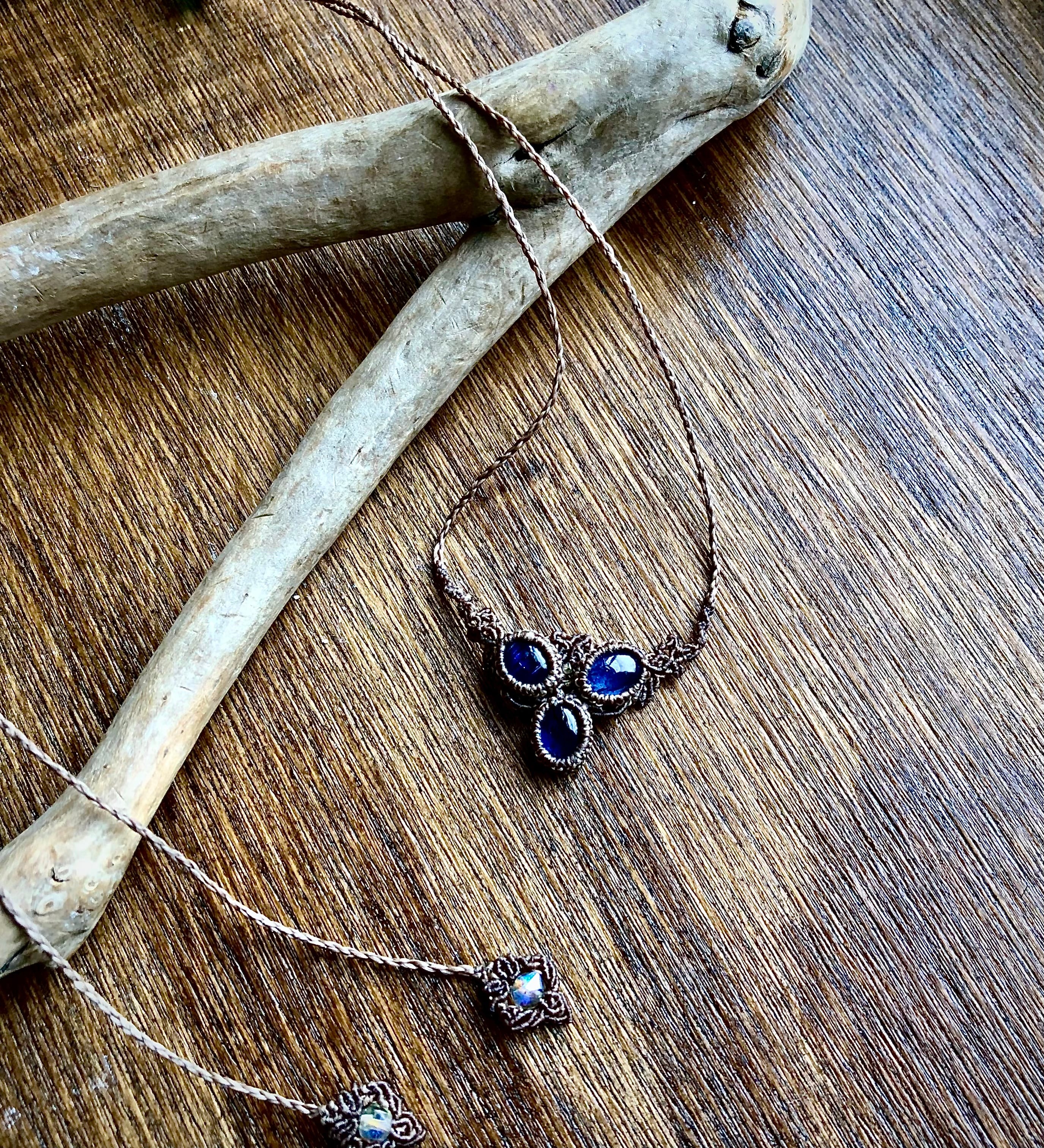 異なる色合いの小粒のカイヤナイトを集めて胸元を飾るペンダントにしました。