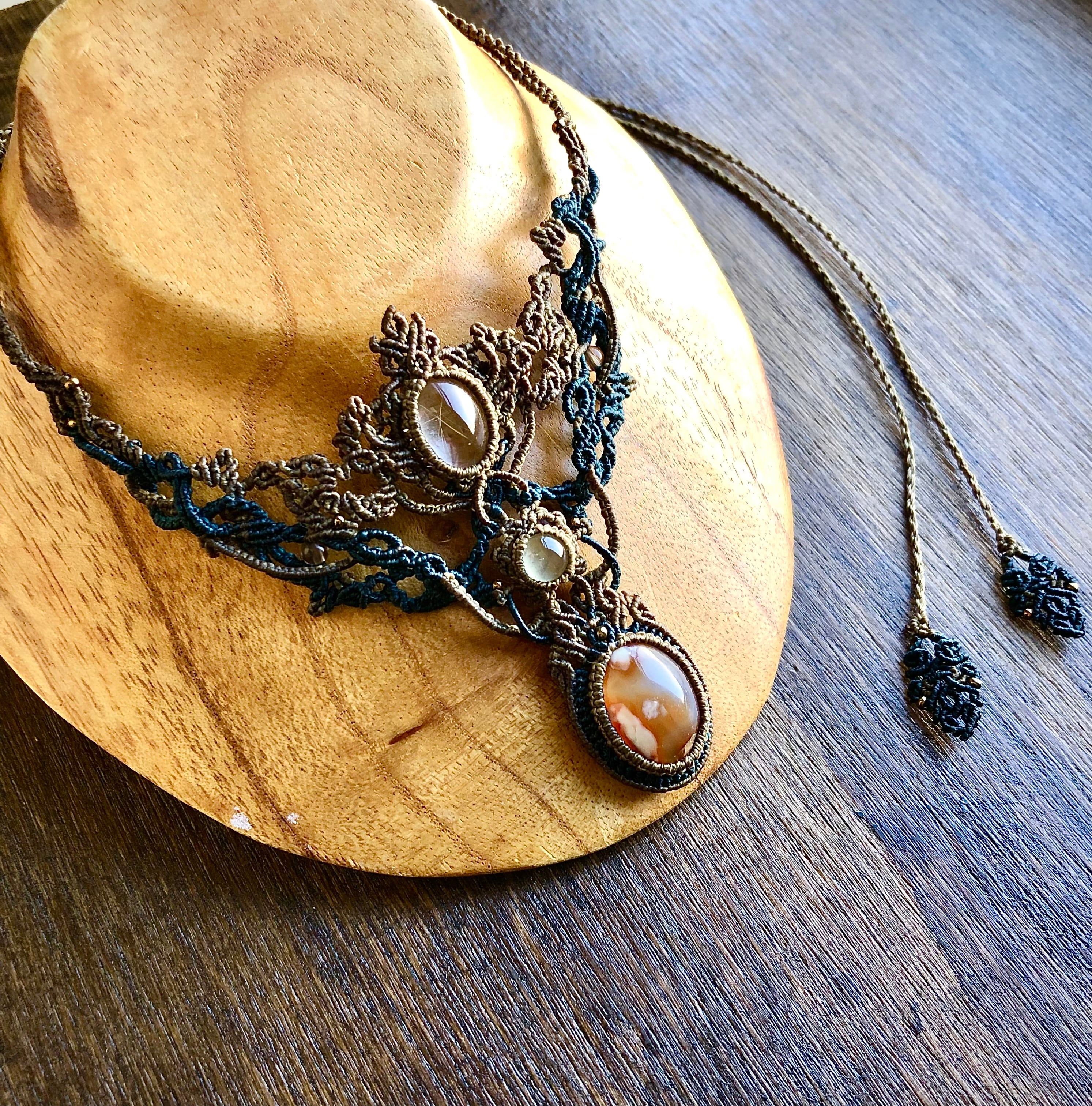 青森県産の斑入りのカーネリアンにプレナイトとルチルクォーツを繋げてチョーカータイプのネックレスにしました。
