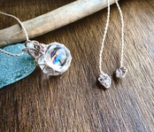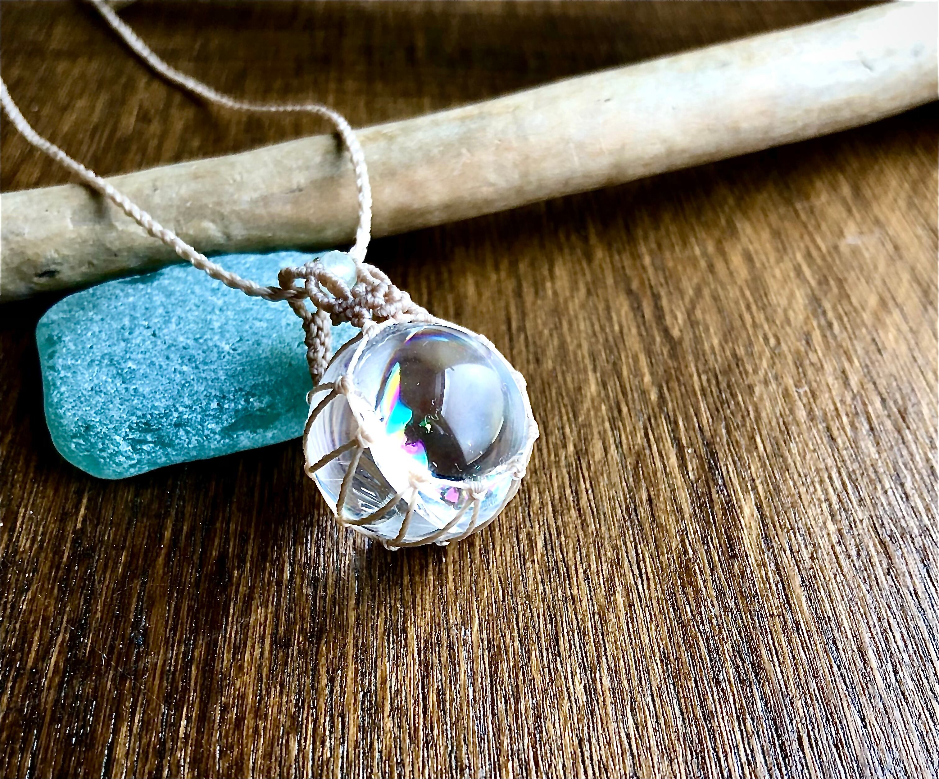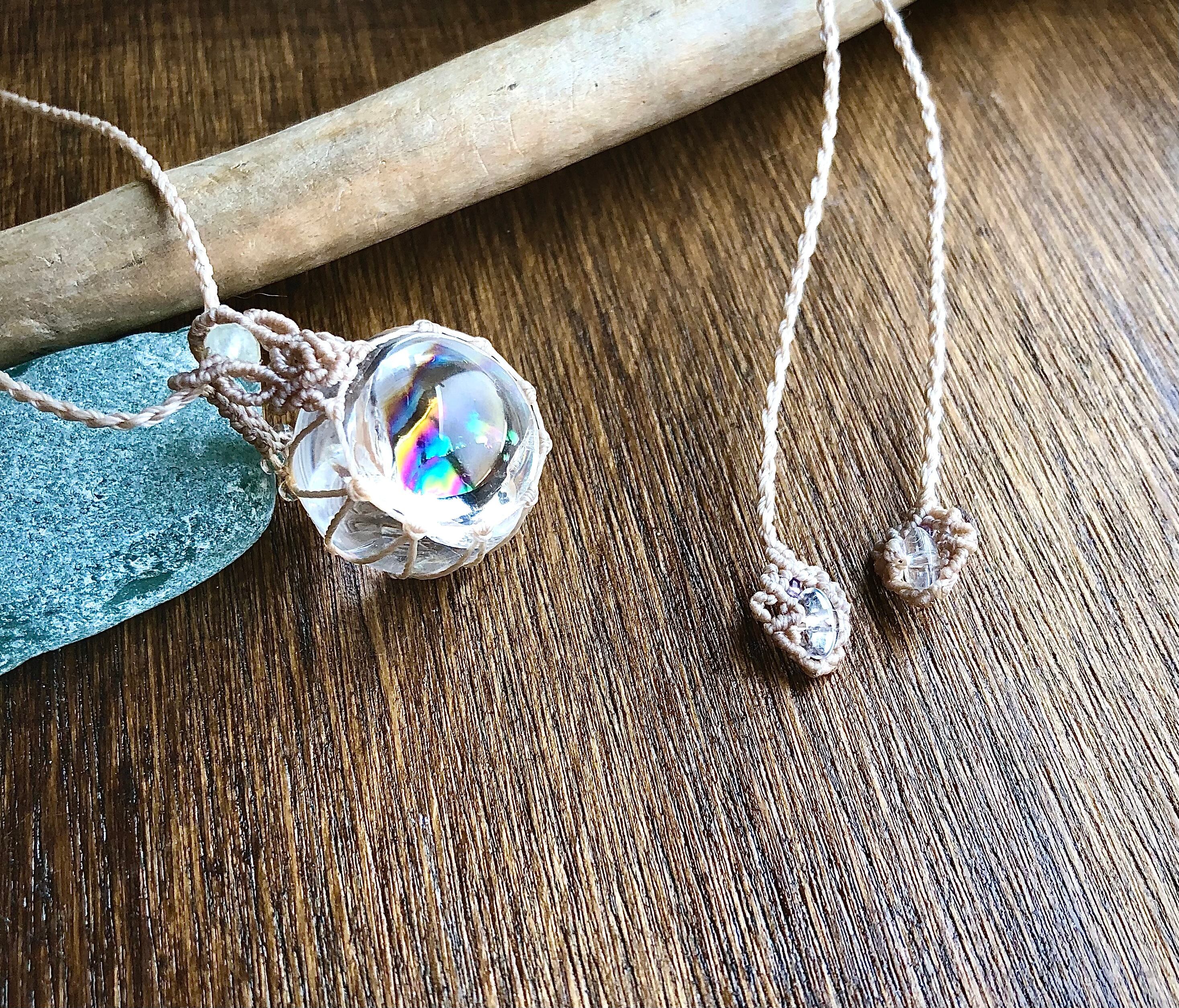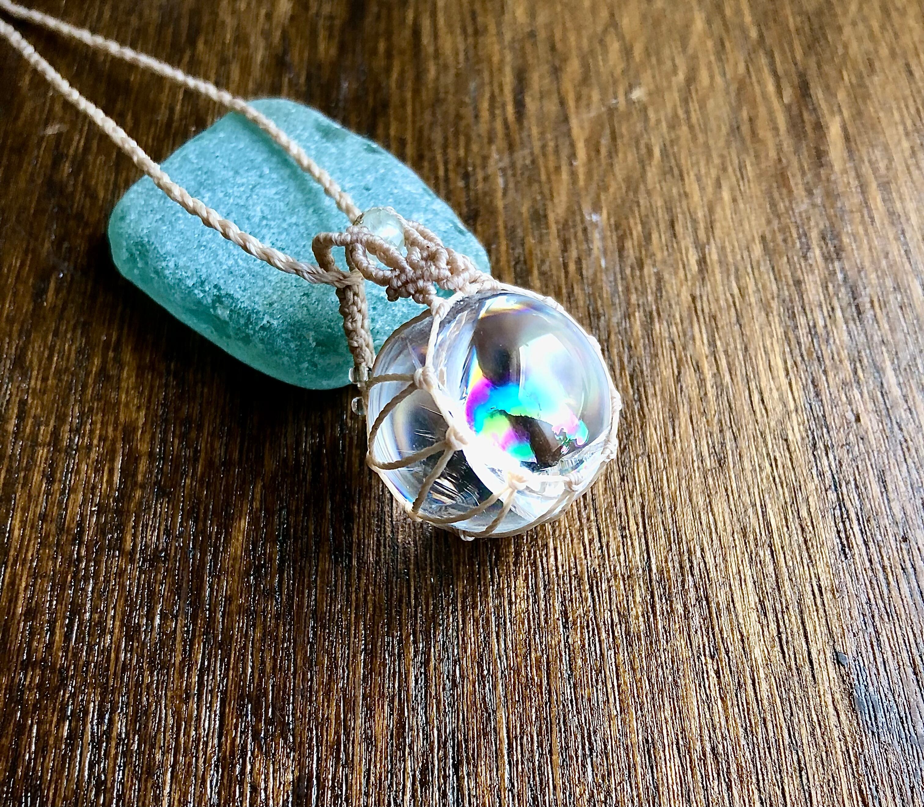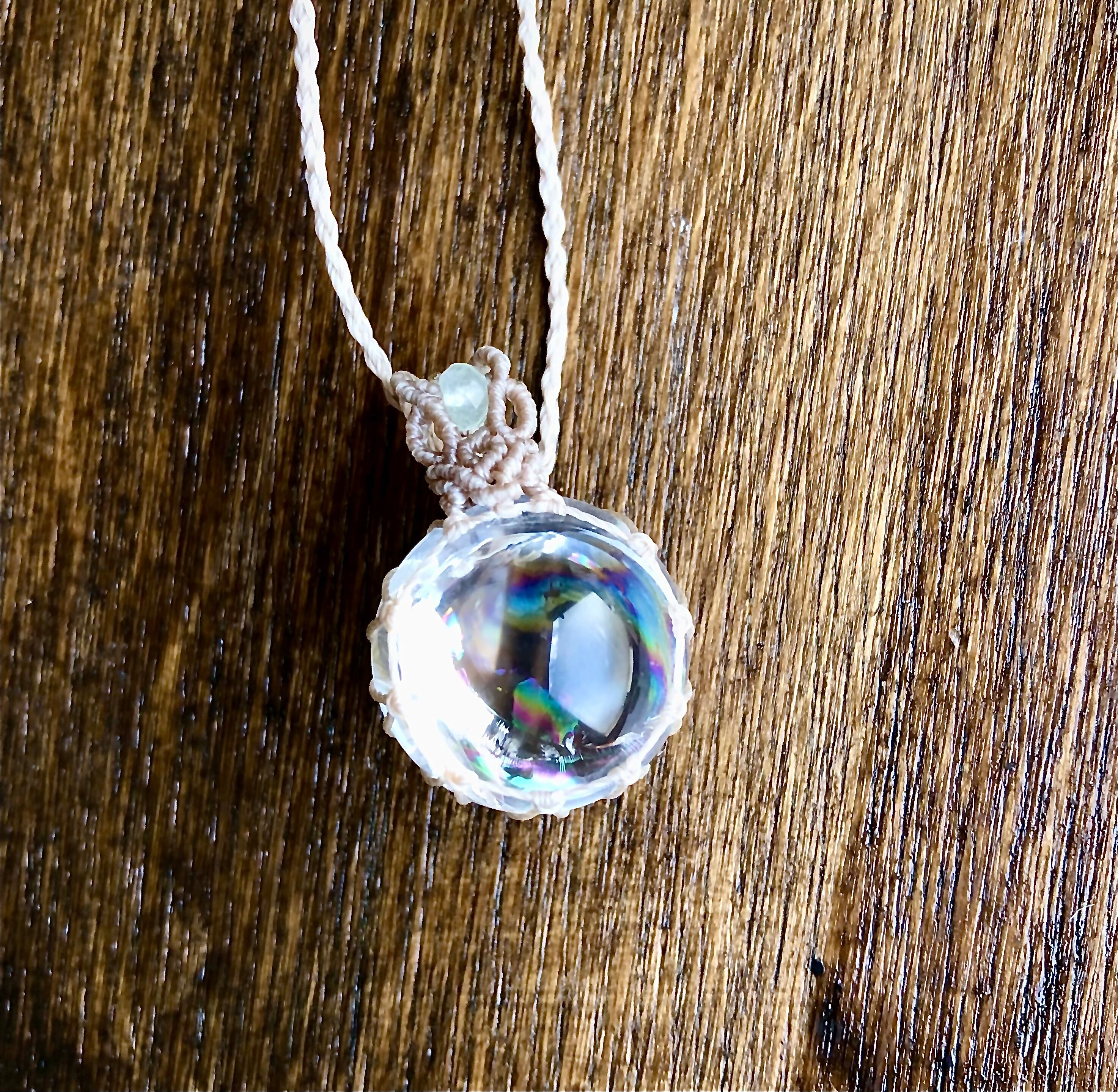 どこから見ても虹の浮かぶ水晶球をペンダントに編みました。