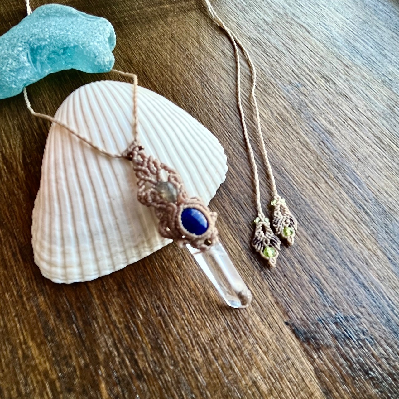シングルポイントの水晶にラピスラズリとラブラドライトのビーズを編み足してペンダントに仕上げました。