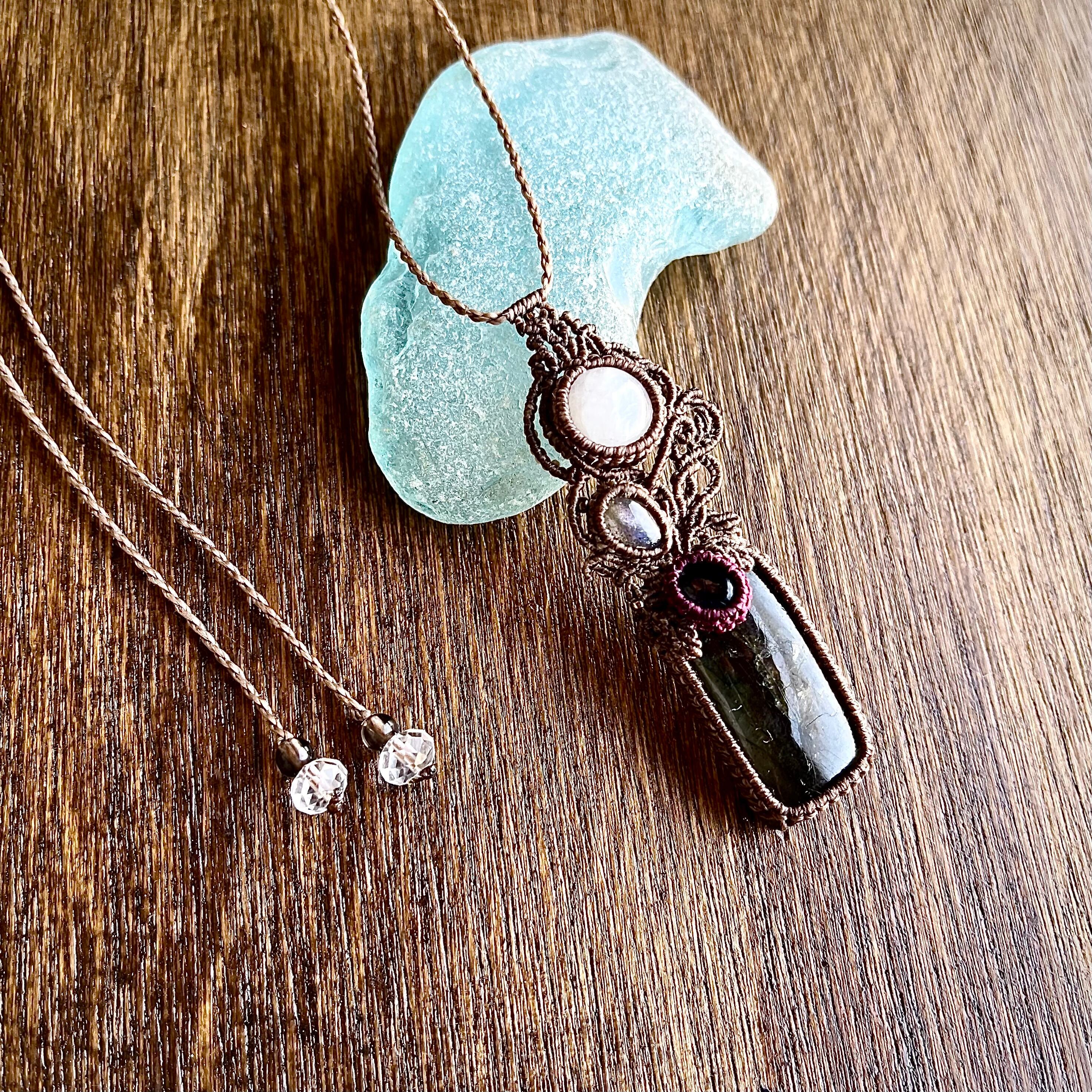 長方形のラブラドライト(スペクトロライト)にアシンメトリーなデザインでホワイトラブラドライト 涙型のラブラドライト カイヤナイトを飾ってペンダントに編みました。