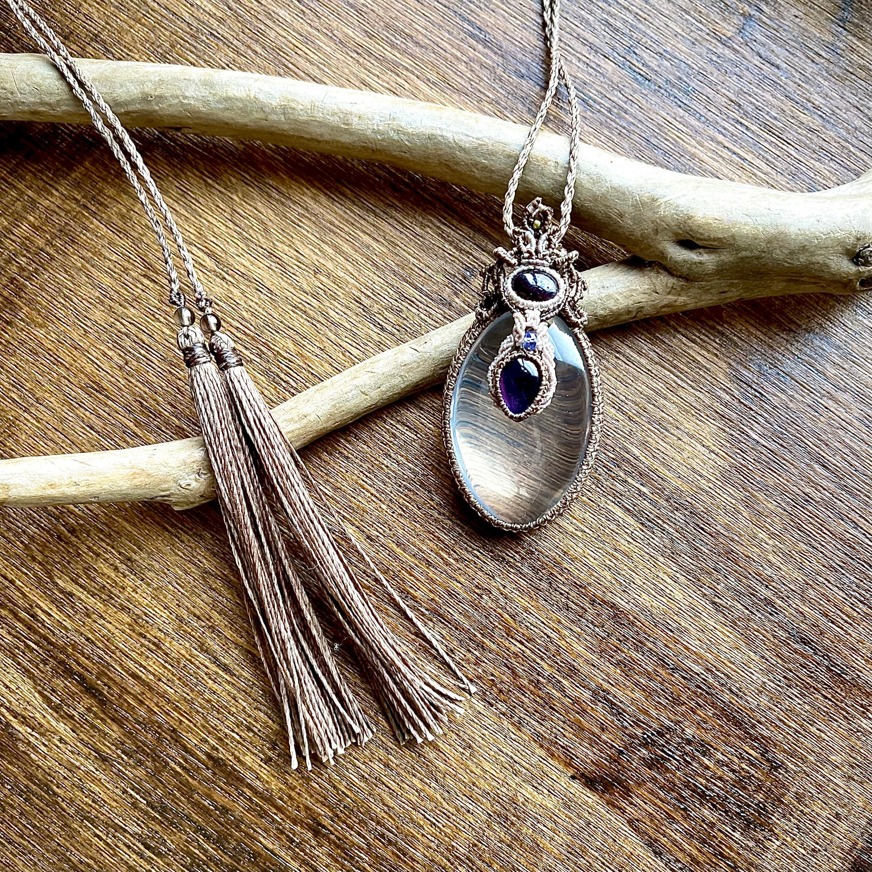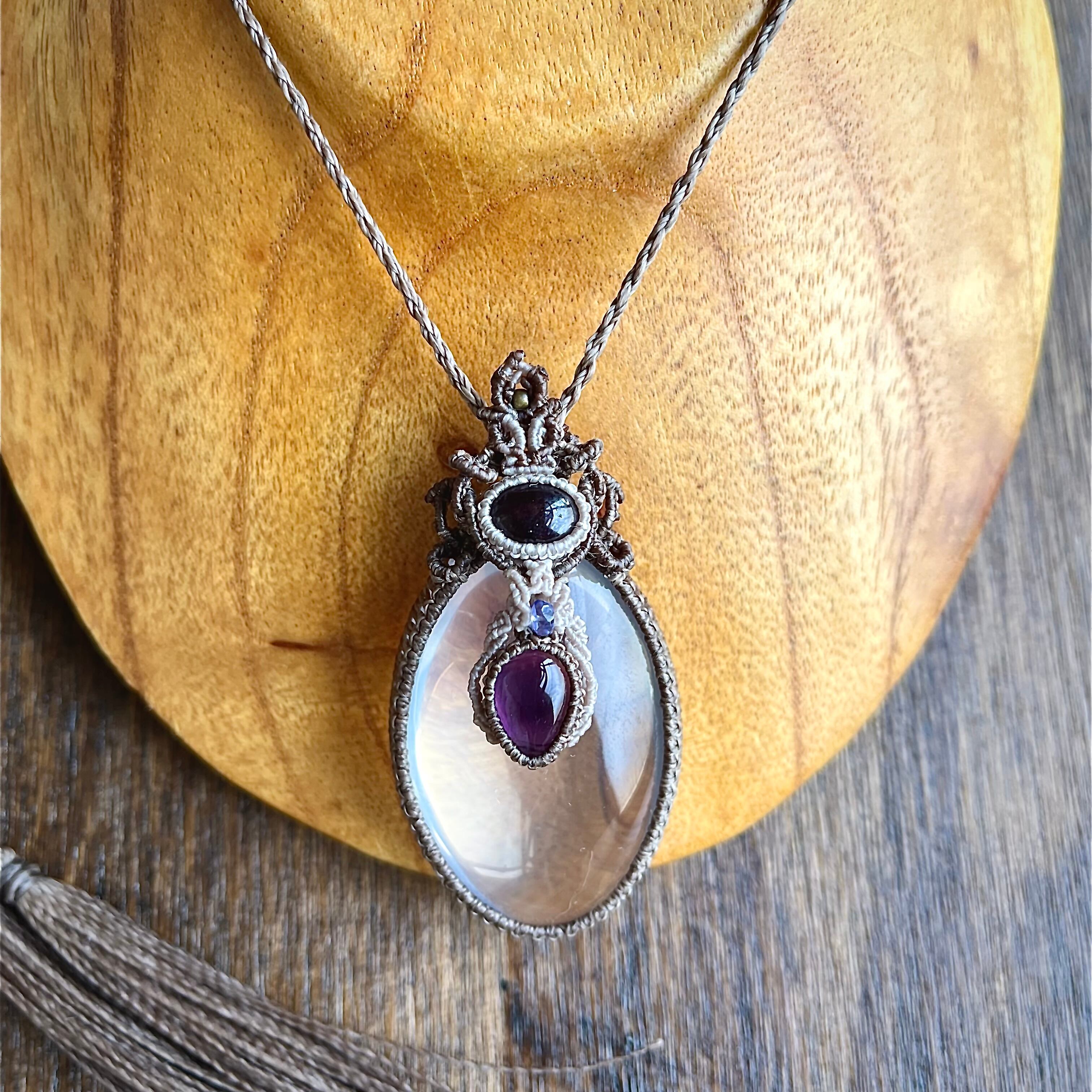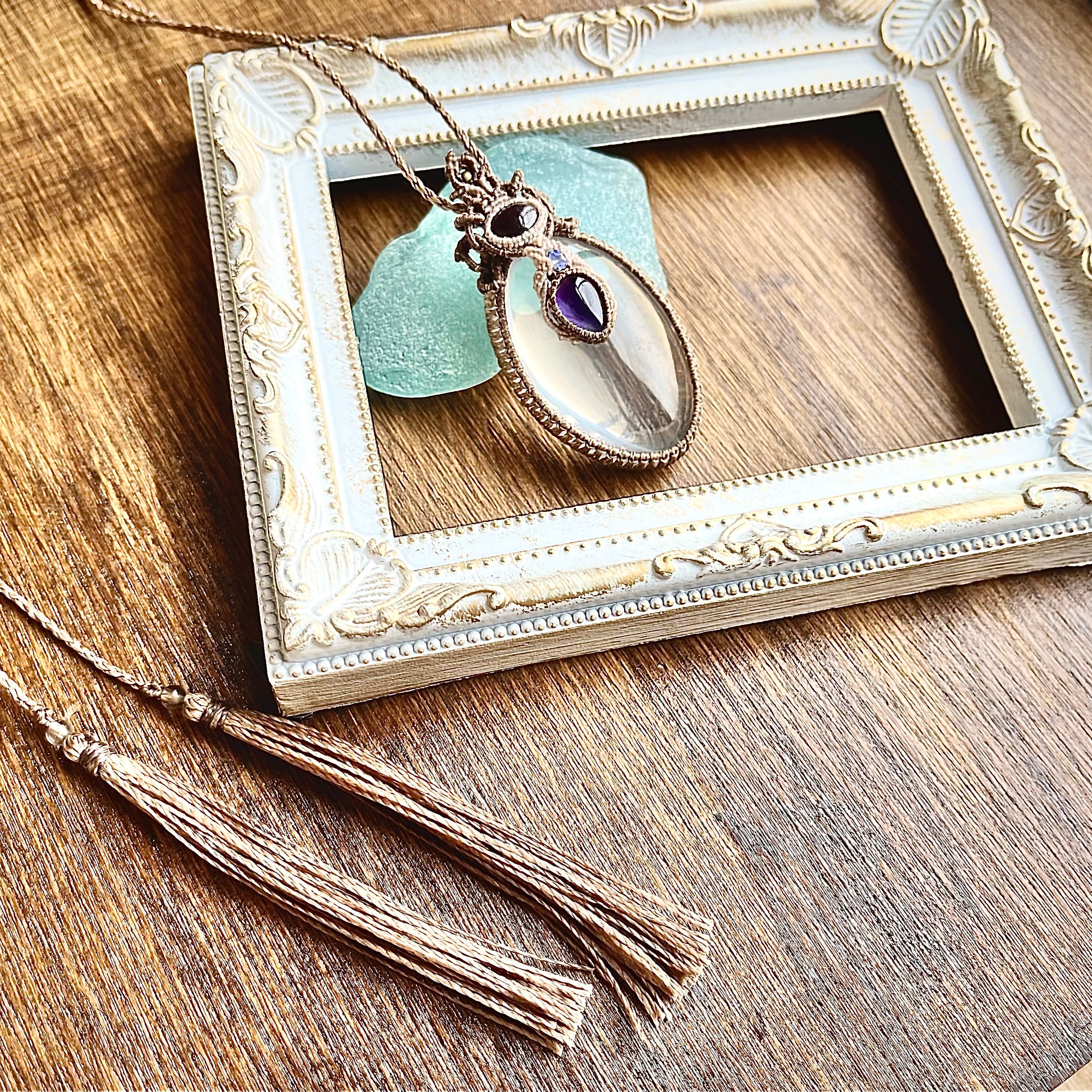大ぶりのジラソルクオーツの上に更にスターガーネット、アイオライトビーズ、アメジストを繋げたペンダントを乗せたペンダントの上にペンダントを飾ったデザインです。