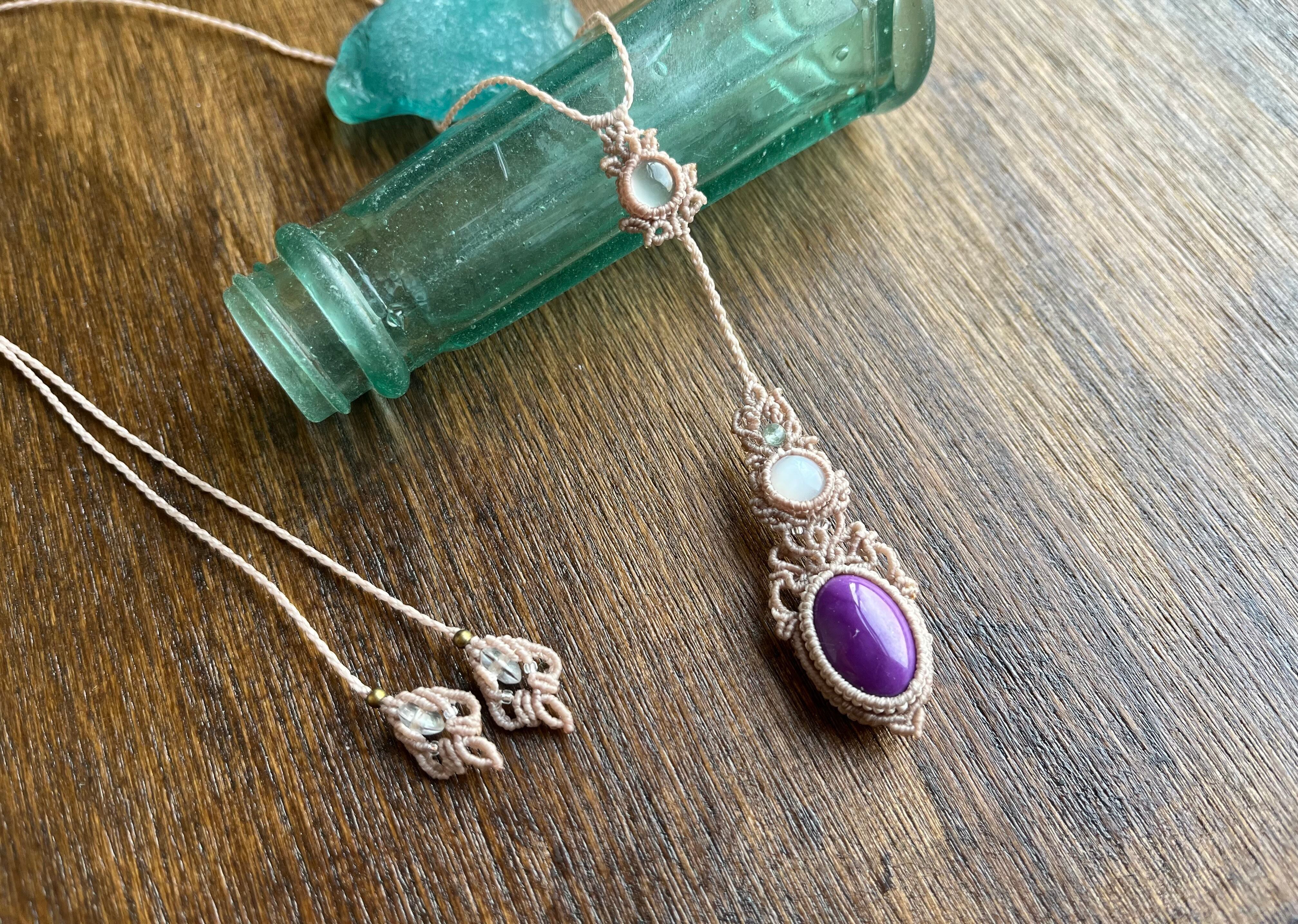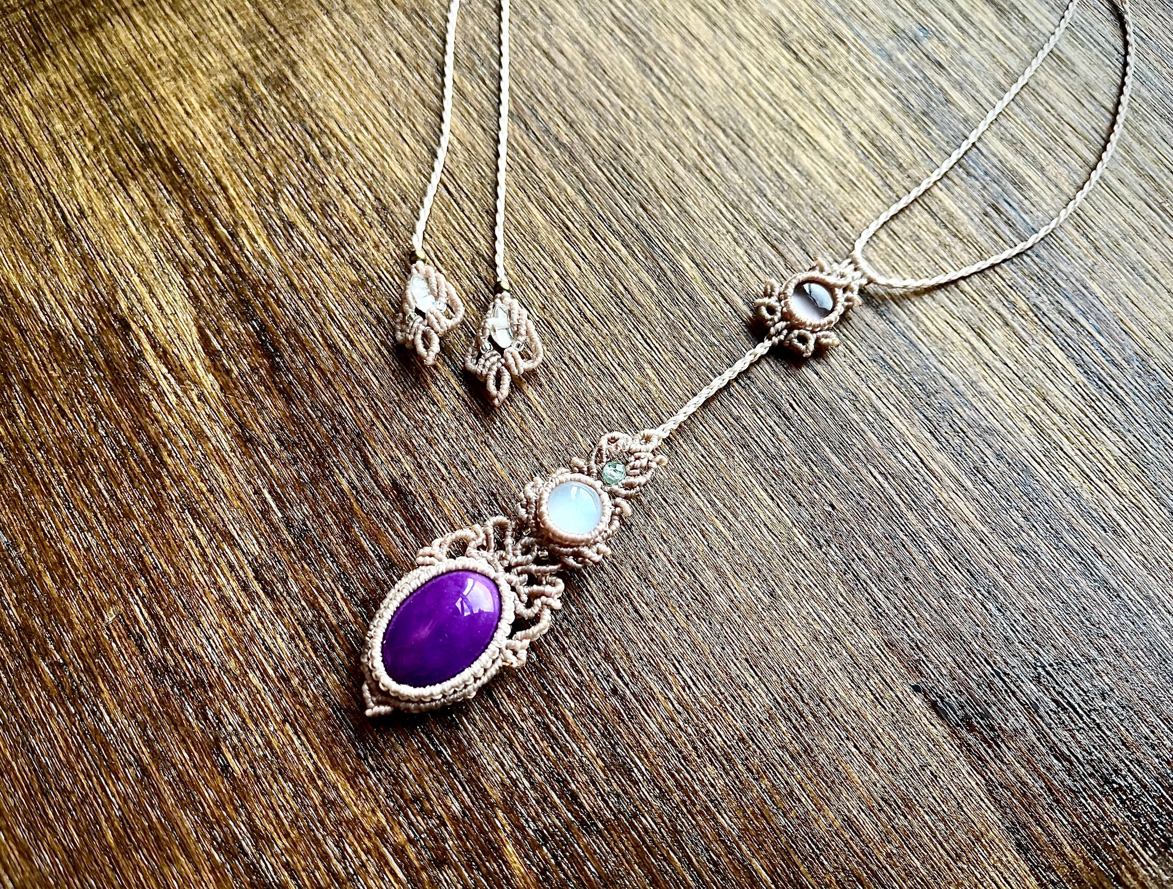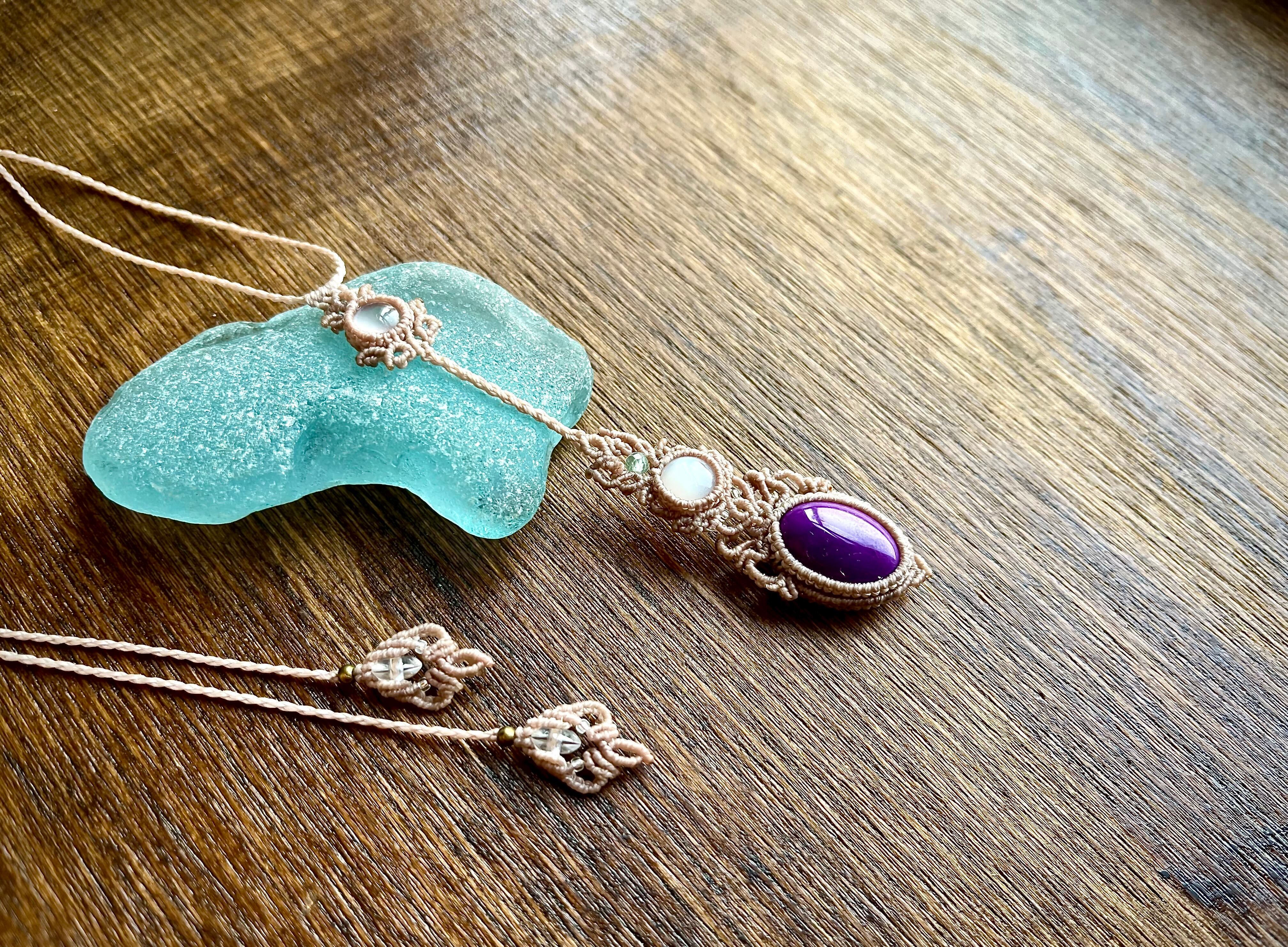 鮮やかなパープルのフォスフォシデライト、ムーンストーン、薄荷色のペリドットをペンダントヘッドに編み、トップのローズクオーツと繋げて揺れるタイプのペンダントにしました。