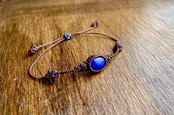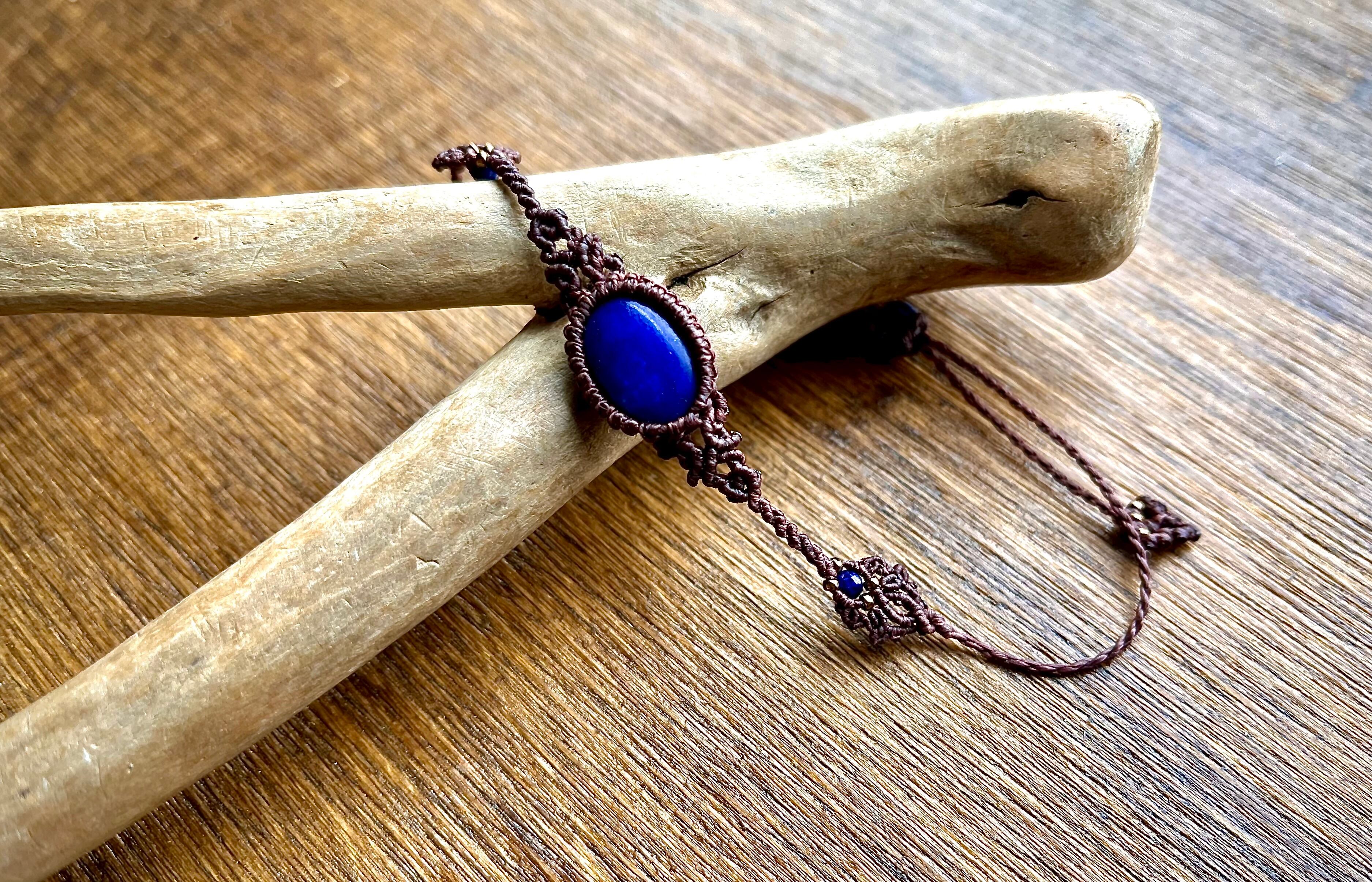ラピスラズリのカボションの両側にも小さいラピスラズリのビーズを装飾編みで飾りました。