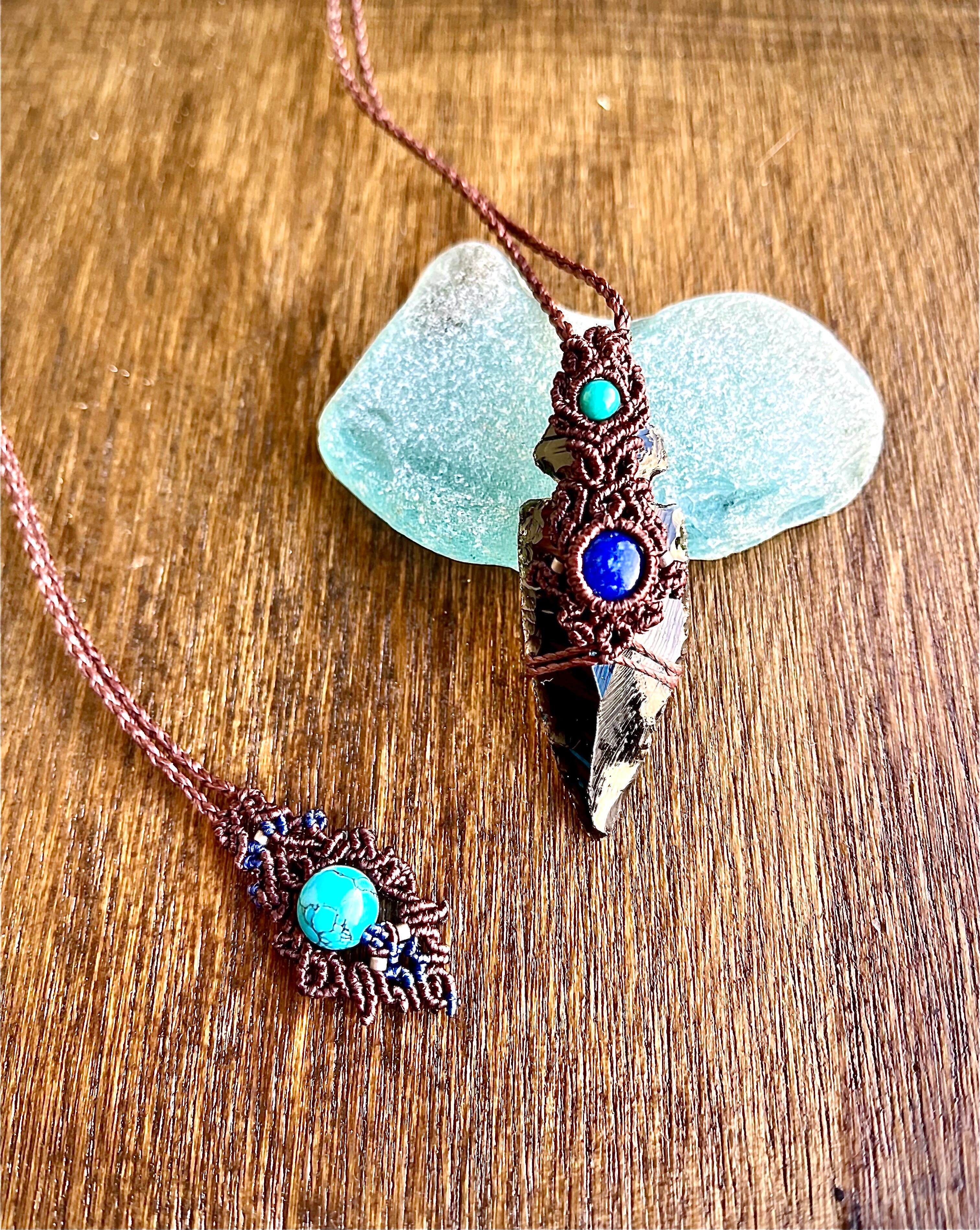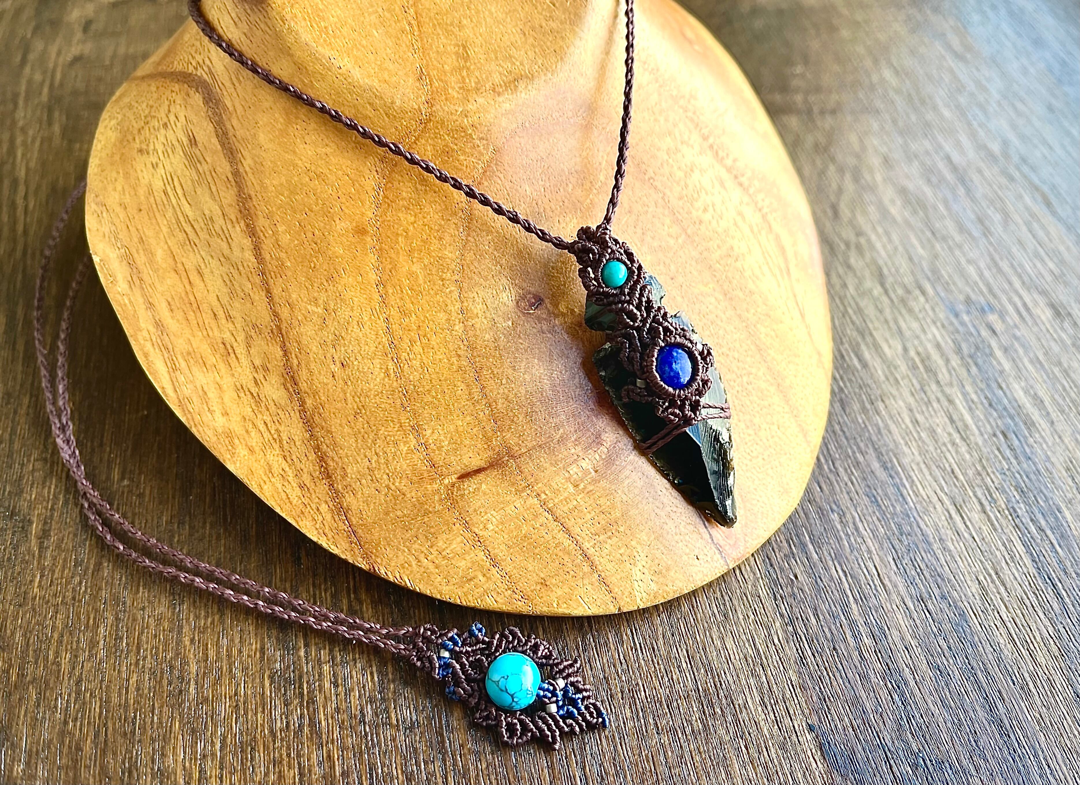 鏃型シェイプされた黒曜石にターコイズ、ラピスラズリを乗せてペンダントに編みました。
