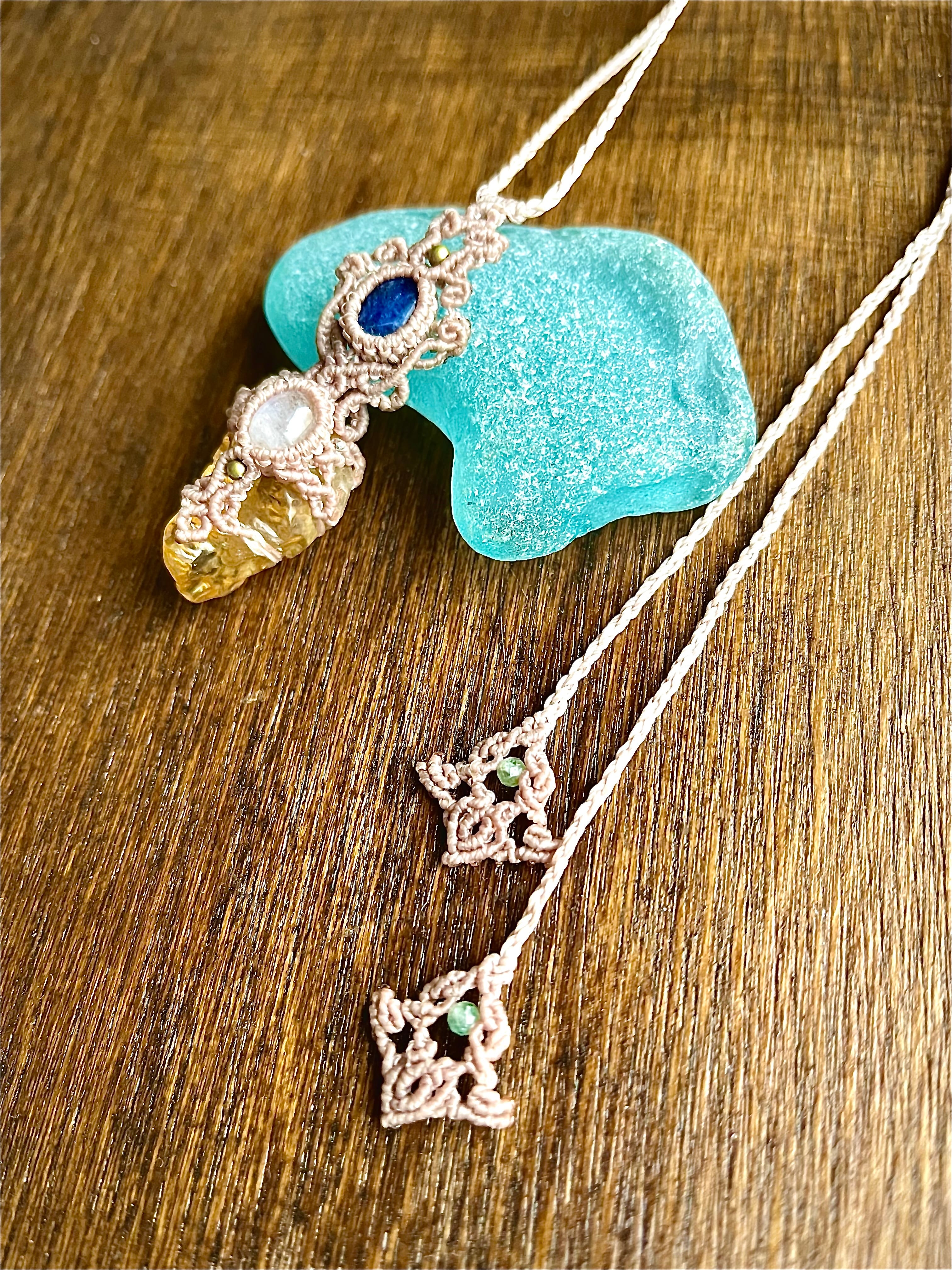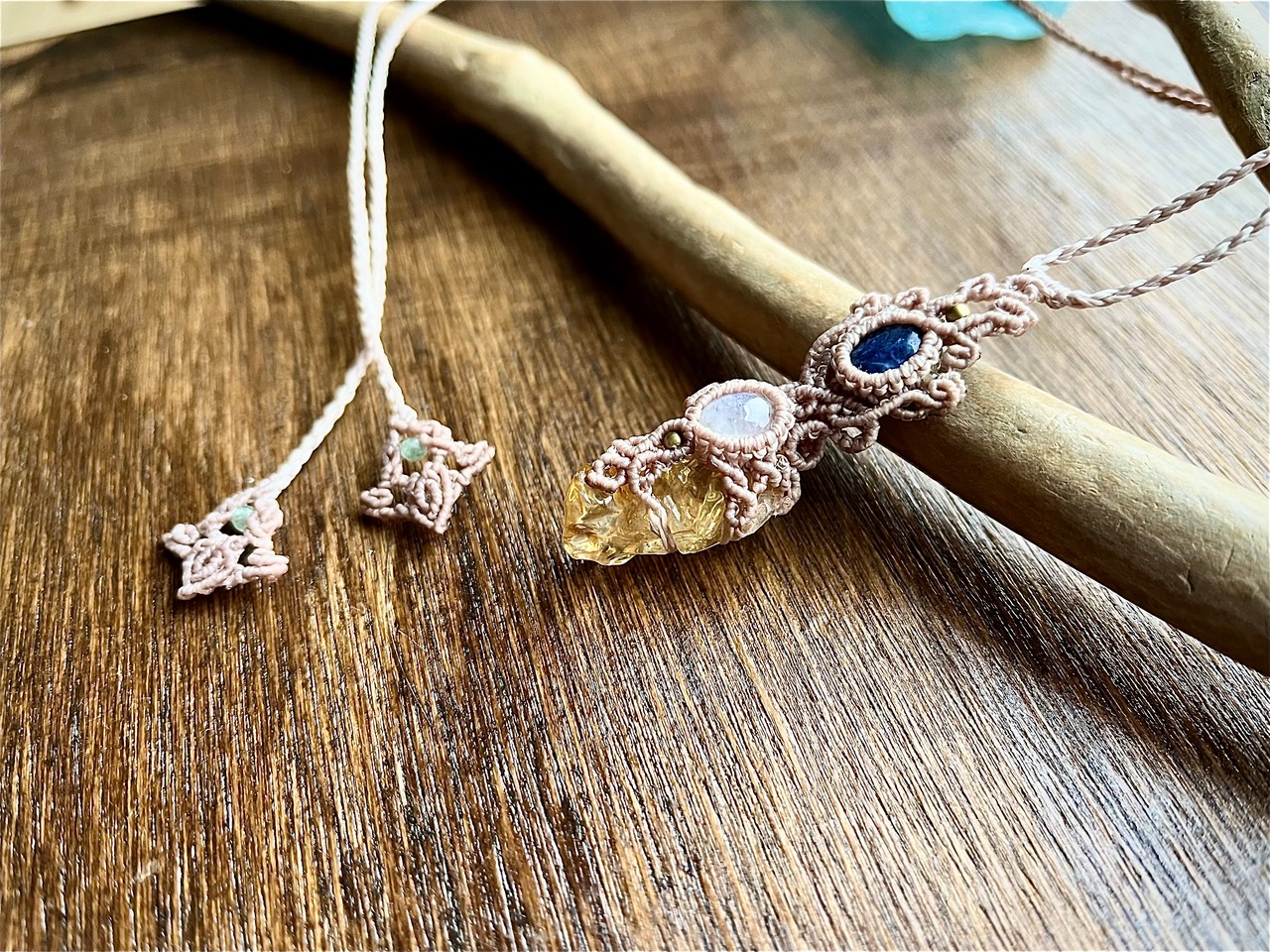 不定形で野趣のあるシトリンを何とか胸元に飾りたいと思い編みました。