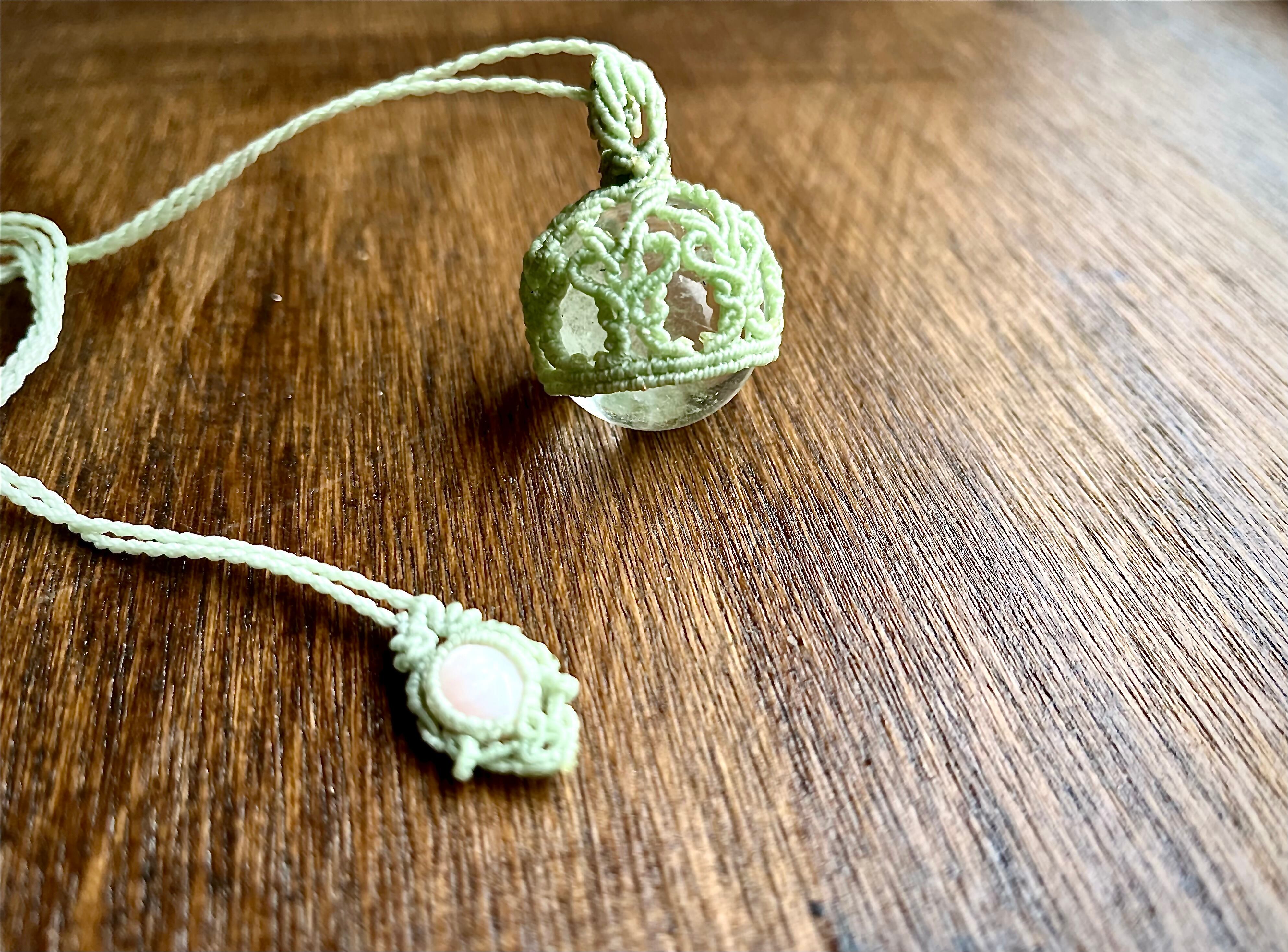 嵐の前のストームグラスの様な模様を湛えた水晶に装飾編みを施してペンダントにしました。
