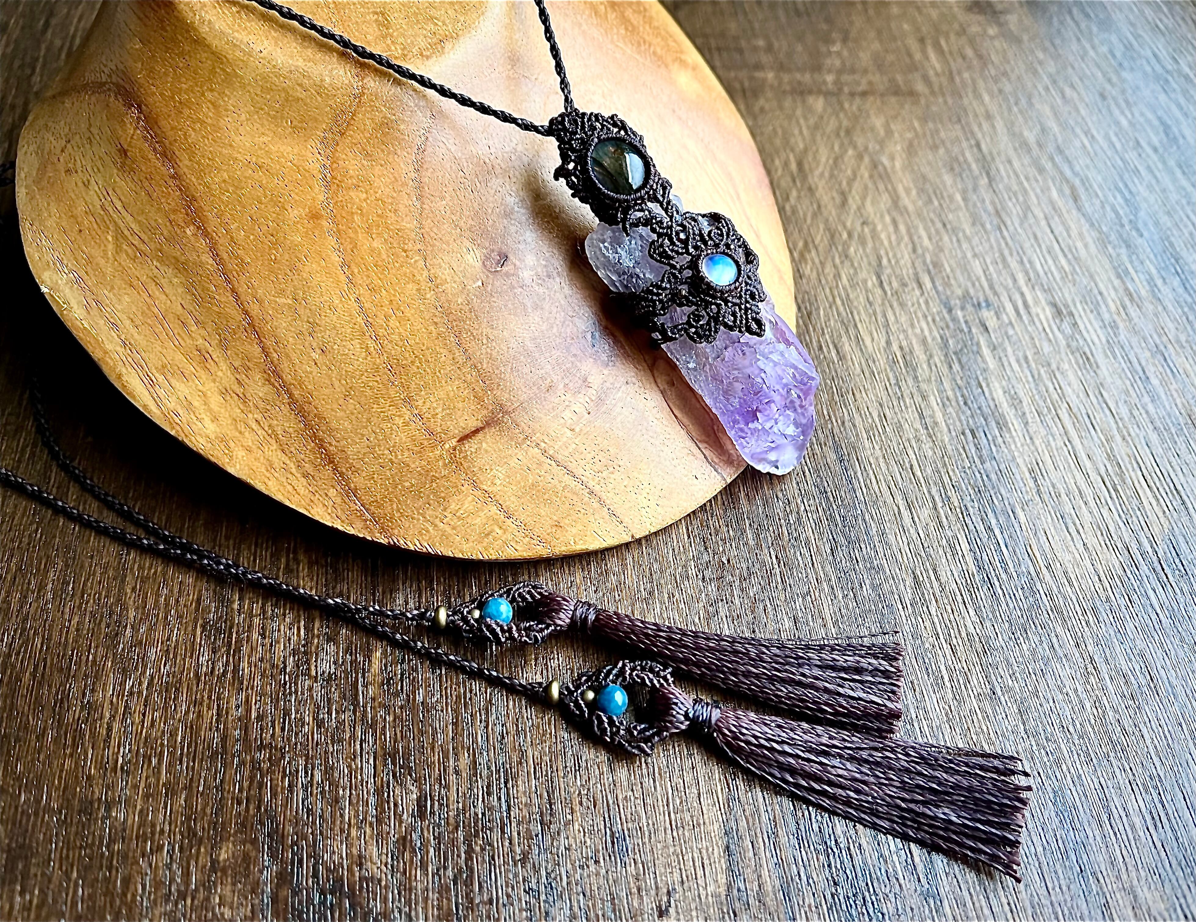 上にホワイトラブラドライトとラブラドライトを飾ってペンダントにしました。