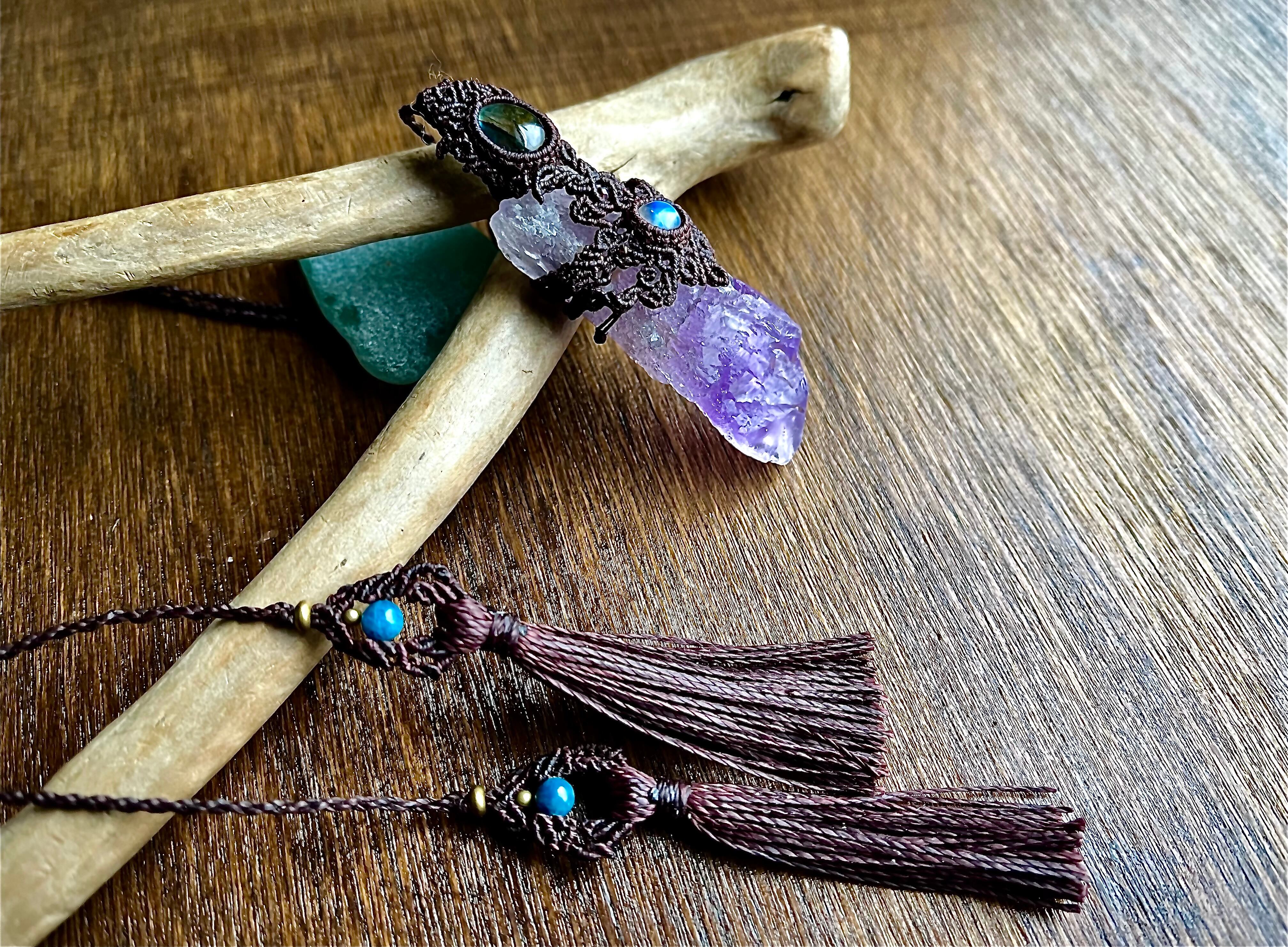 マクラメコードで編んだアジャスターで長さを調節出来るフリーサイズです。
