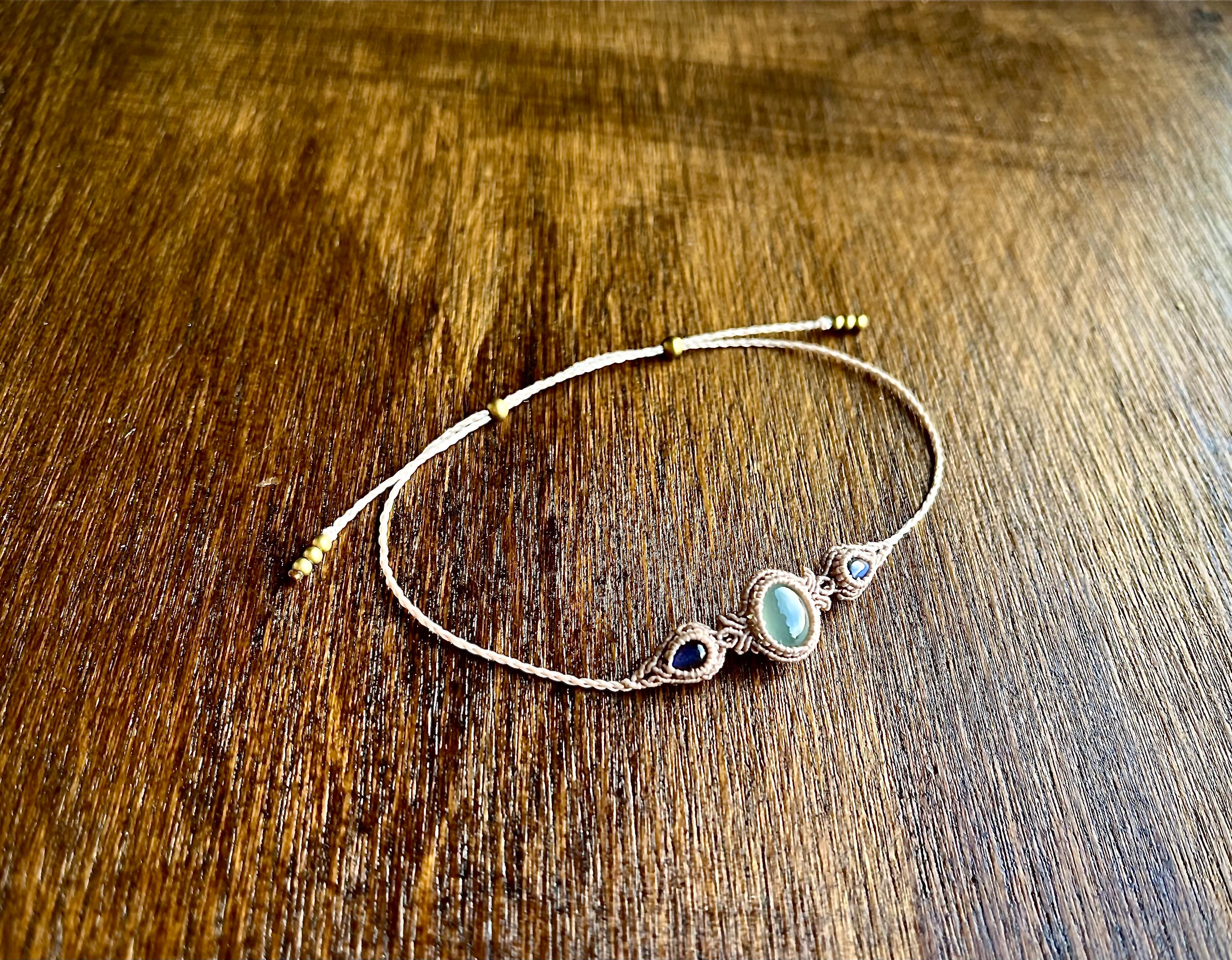 真ん中に薄いグリーンのライムグリーンカルセドニー、両端に涙型のラブラドライトを配置したブレスレットです。