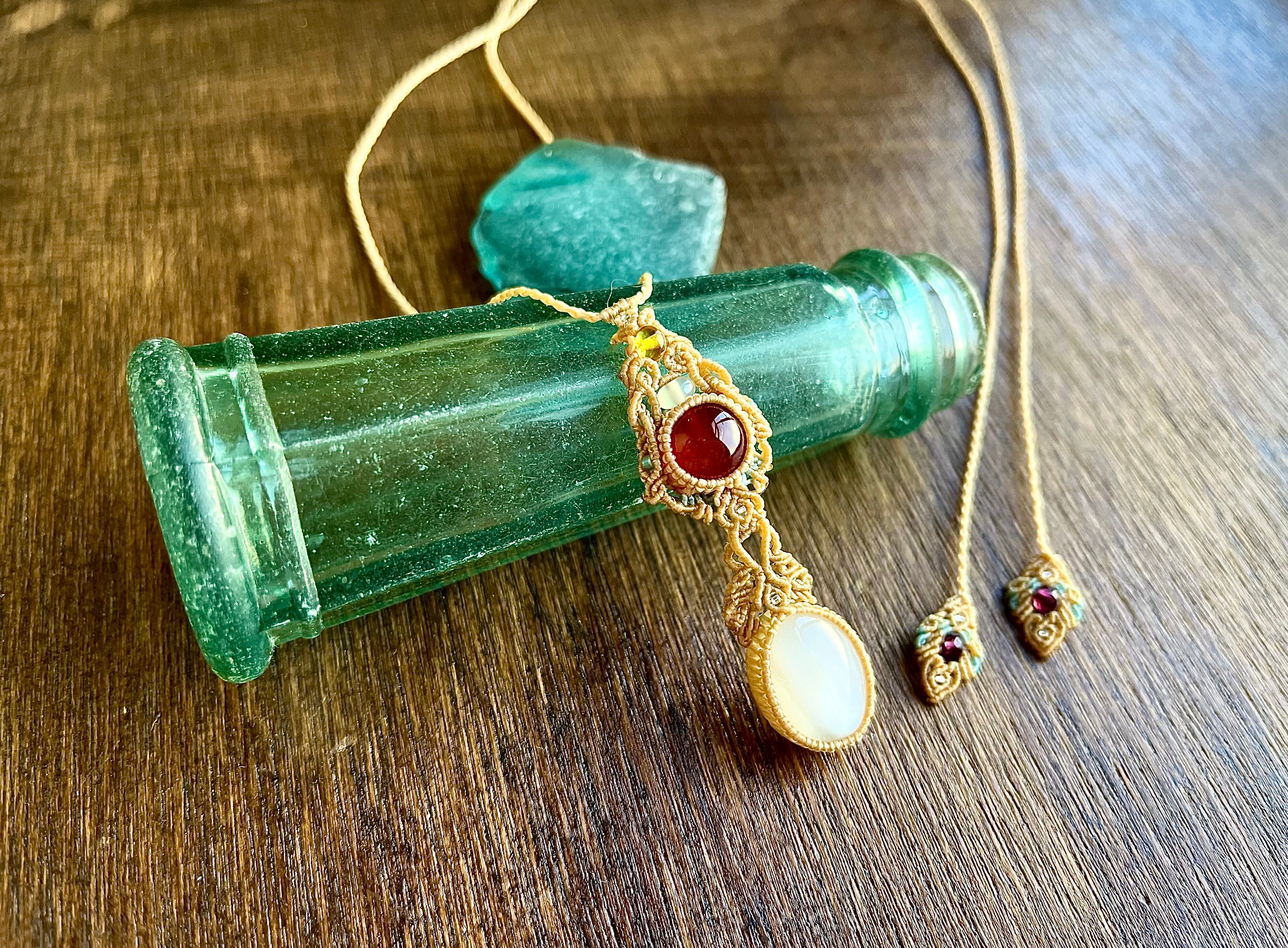 濃い赤のカーネリアンとムーンストーンを繋げてその上に乳白色のジェイド、琥珀のビーズを飾りました。