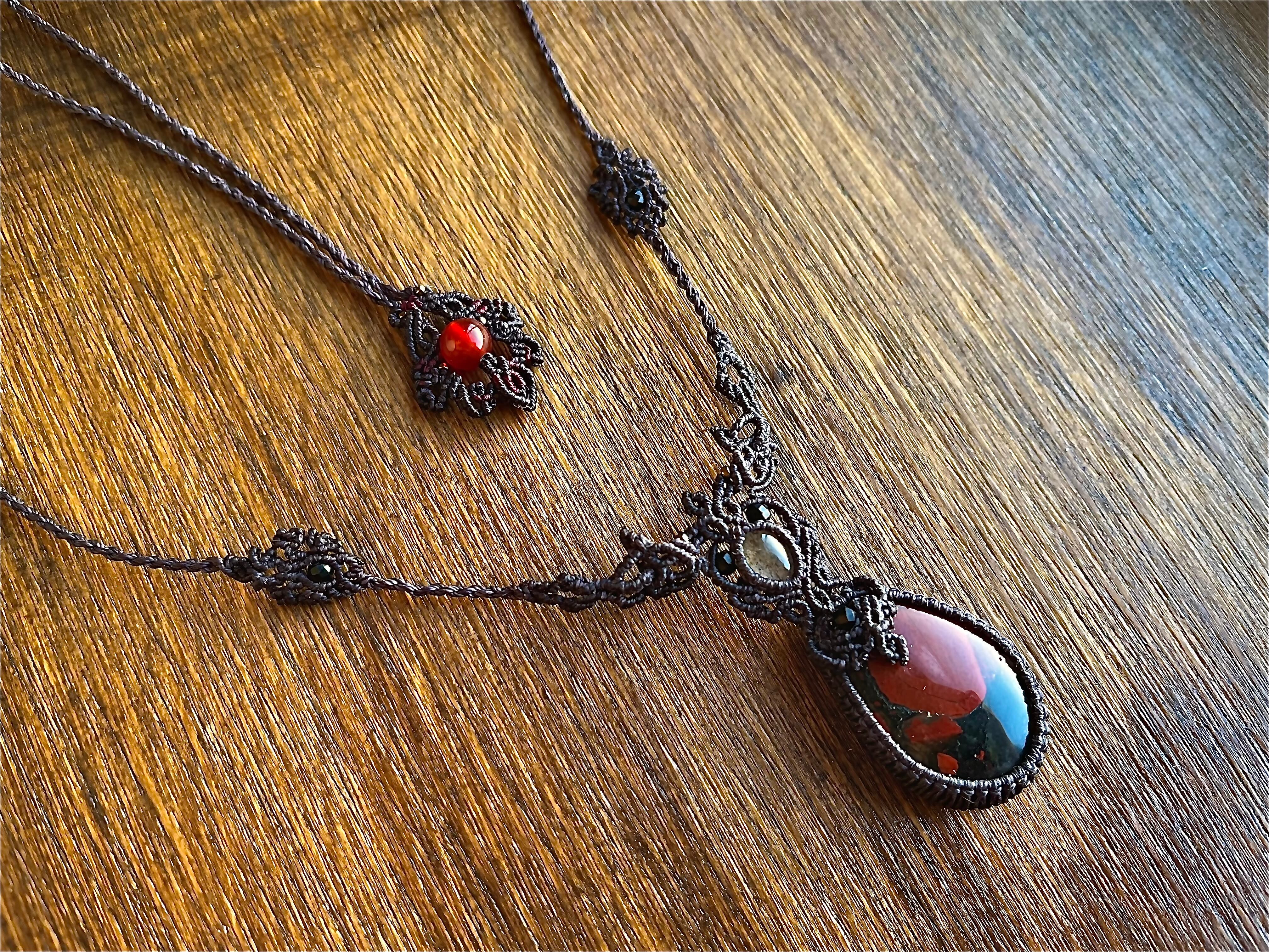 ブラッドストーンの上にはラブラドライトを連結させて、周りにオニキスを散りばめてネックレスにしました。