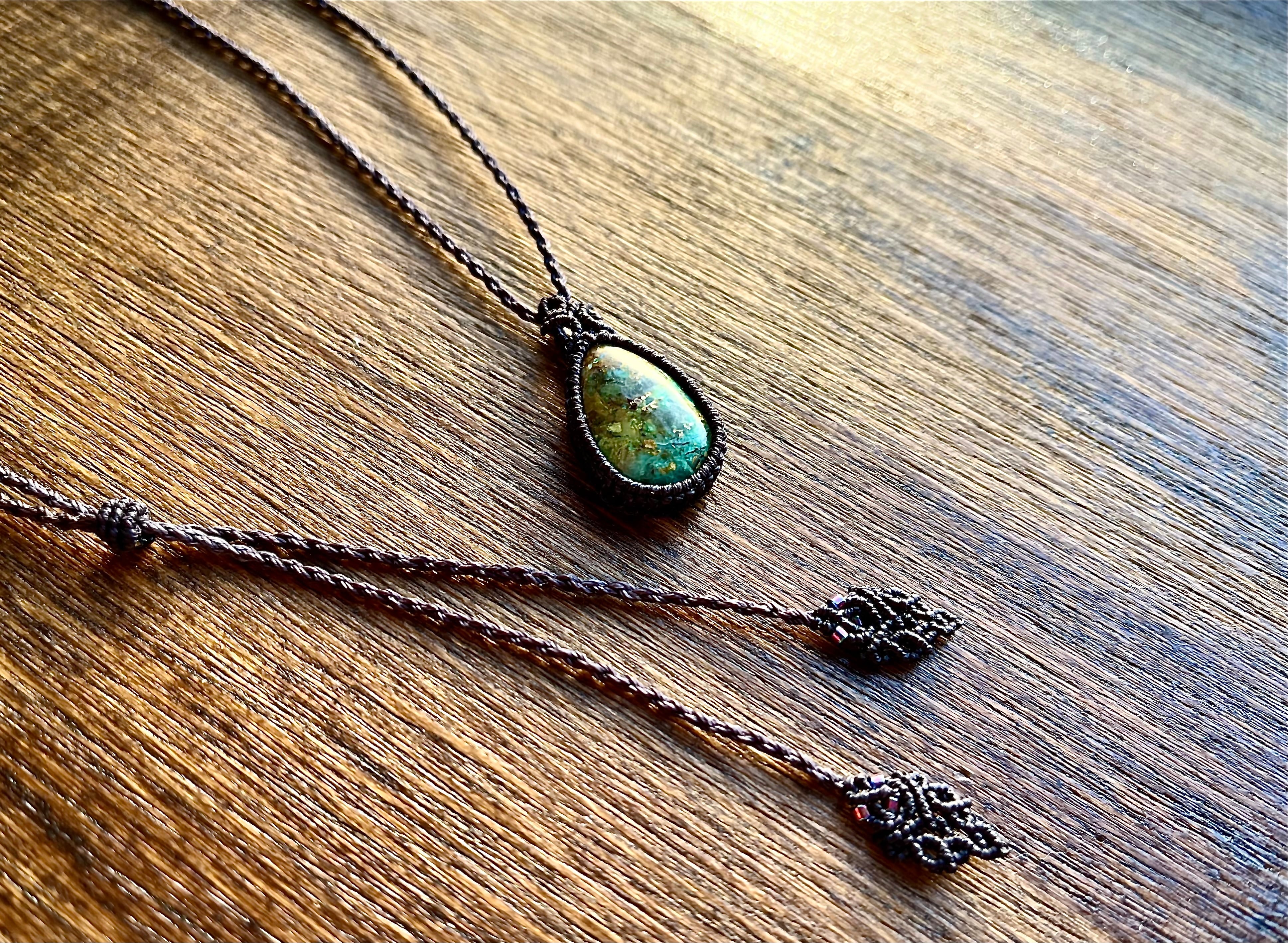 明るいターコイズ色とアースカラーが混在するクリソコラのカボションをシンプルなデザインで編みました。